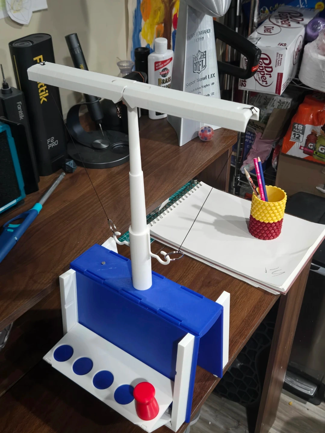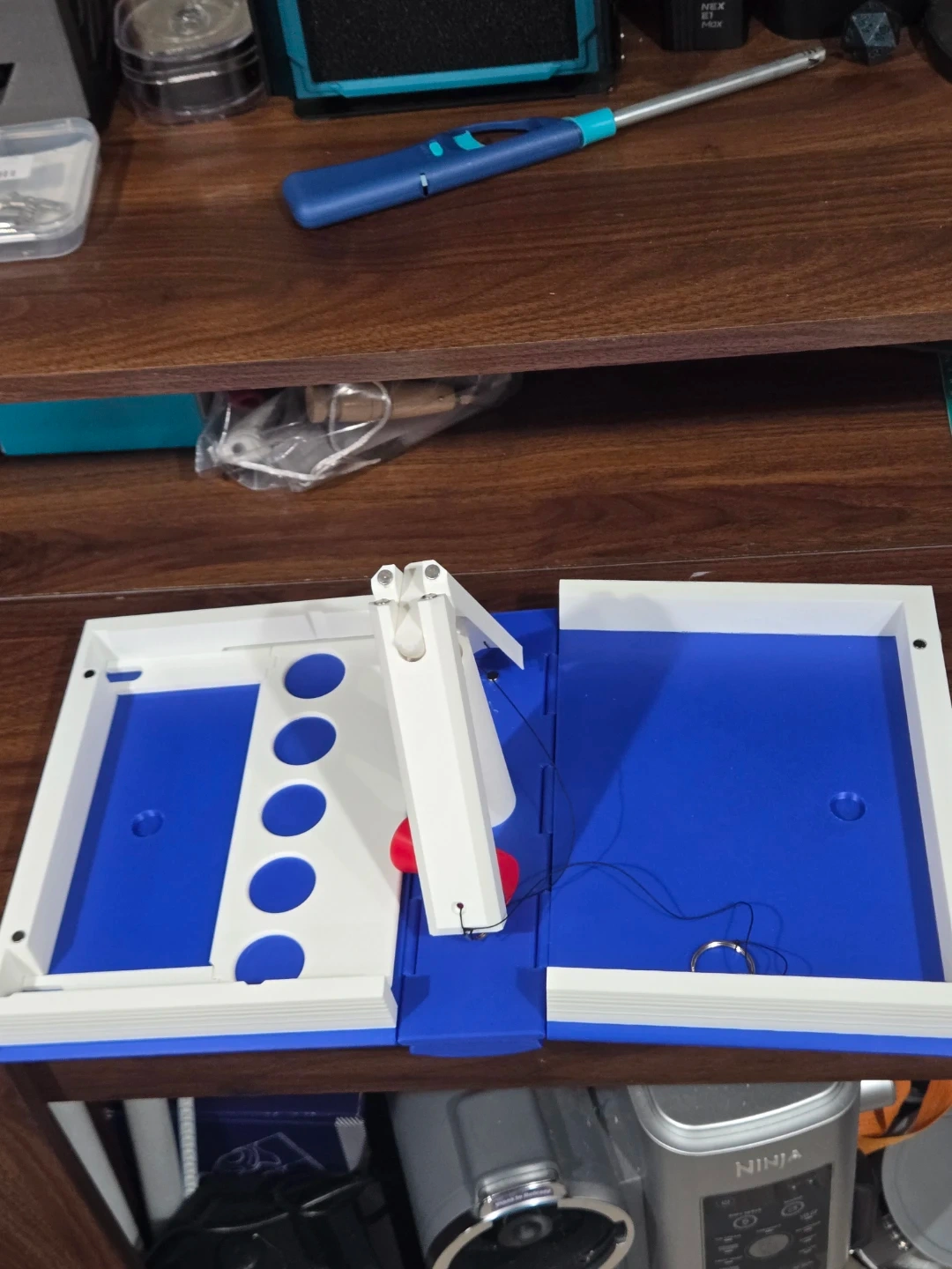 This is a hook and ring toss game in a blue carrying case. It's a fun game for parties or casual get-togethers. The set includes the game and all visible components.