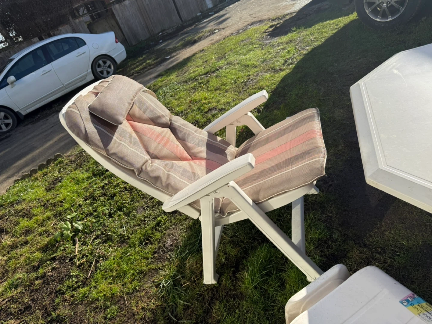 Selling a very good quality outdoor patio set. The chairs are hard, durable plastic (not cheap quality) and very sturdy.