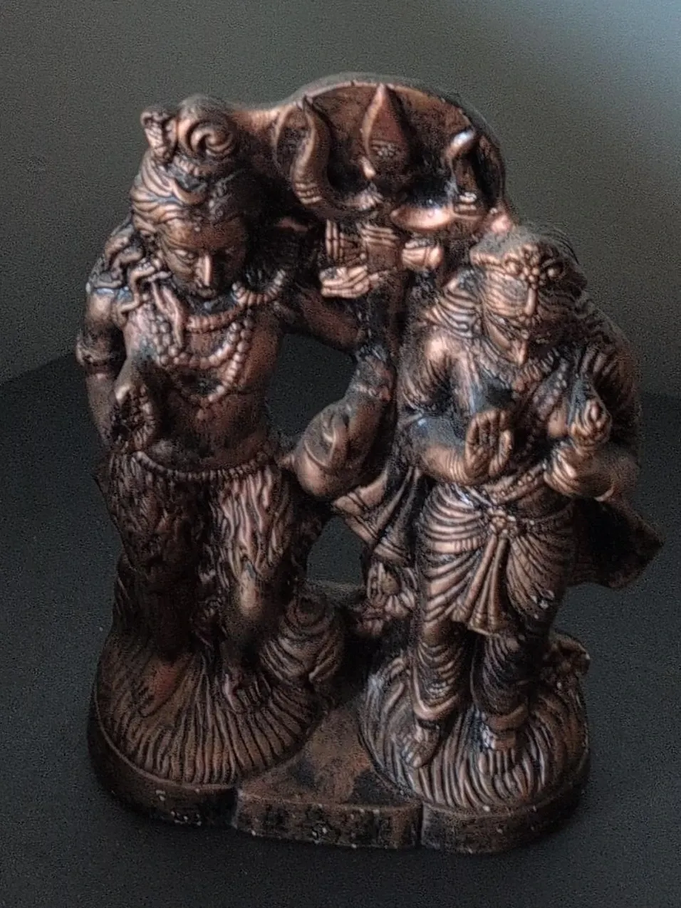 A copper-toned statue depicting Hindu deities. It's made of resin and has intricate detailing. This piece would suit a shelf or altar.