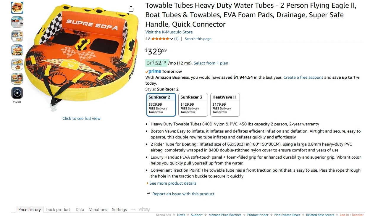 Heavy Duty Towable Tubes 840D Nylon & PVC. 450 Ibs capacity 2 person, 2-year warranty