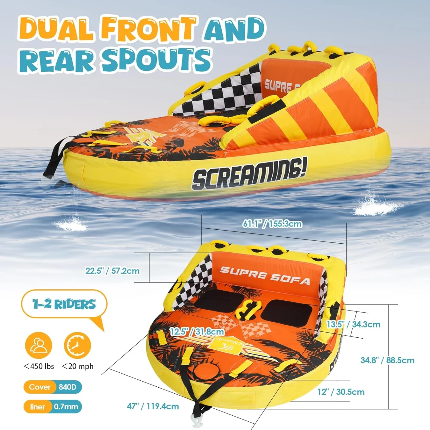 2 Rider Tube for Boating: inflated size of 63x59x31in(160*150*80CM), using a large 0.8mm heavy-duty PVC airbag, completely wrapped in 840D double-stitched nylon cover to ensure comfort and years of use