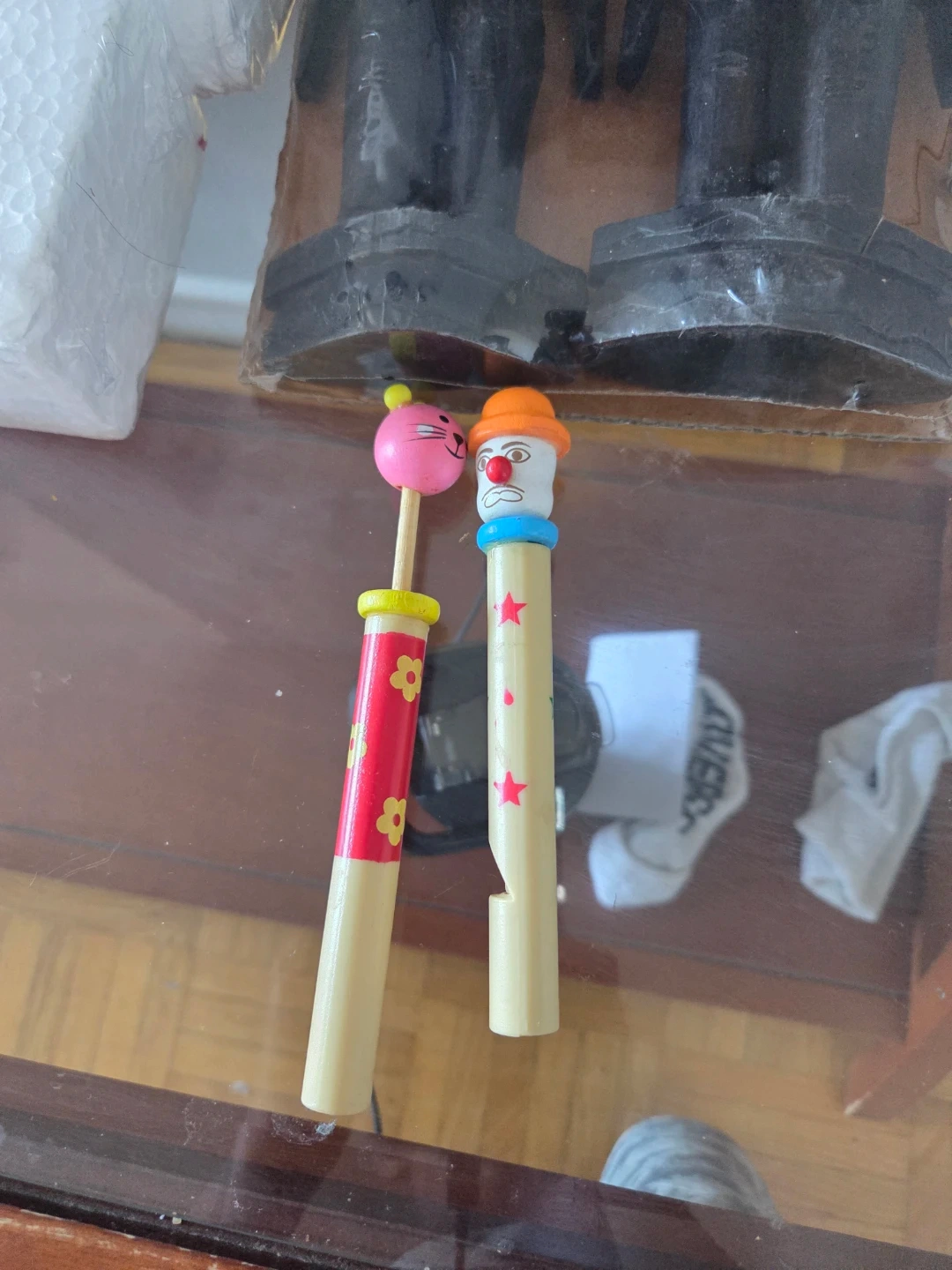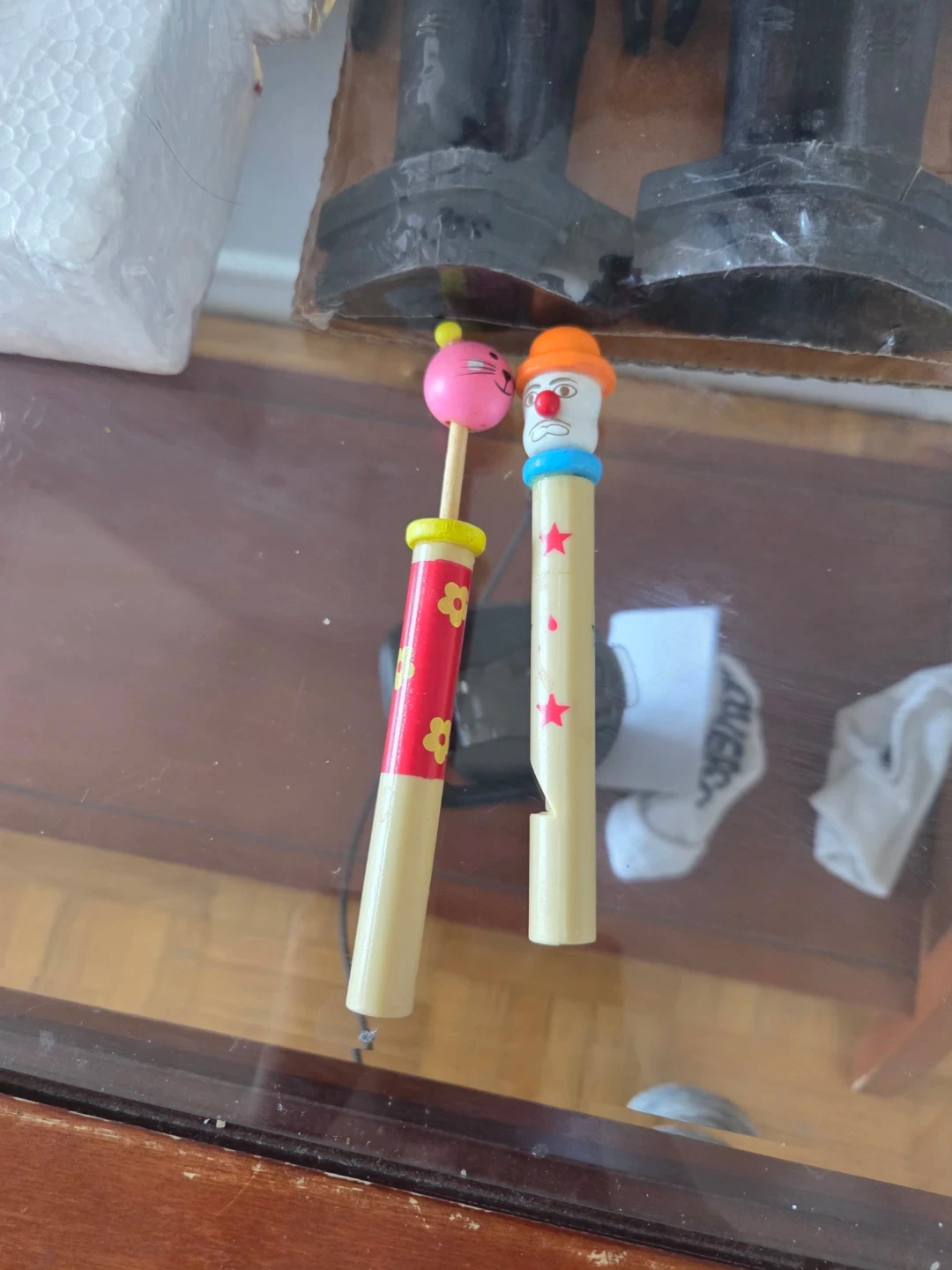 These are two wooden whistles, one with an animal face and the other with a clown face. They're decorated with painted flowers and stars. They produce a fun sound when blown into!