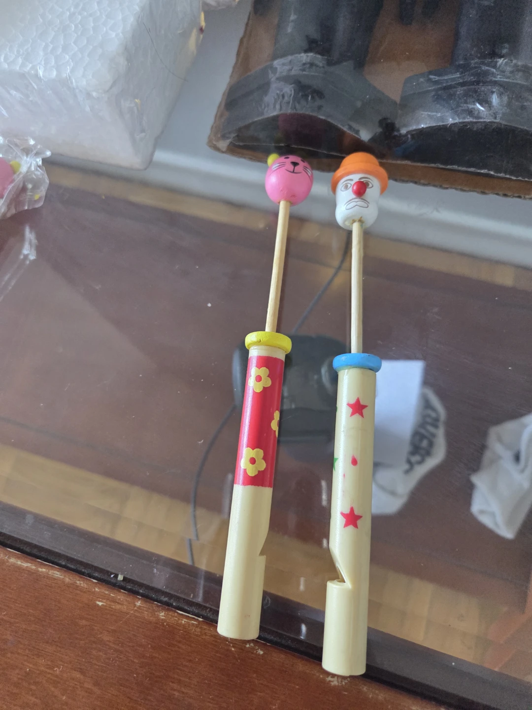 These are two wooden whistles, one with an animal face and the other with a clown face. They're decorated with painted flowers and stars. They produce a fun sound when blown into!