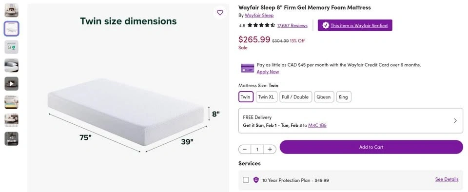 WAYFAIR Firm Gel Memory Foam Mattress included.