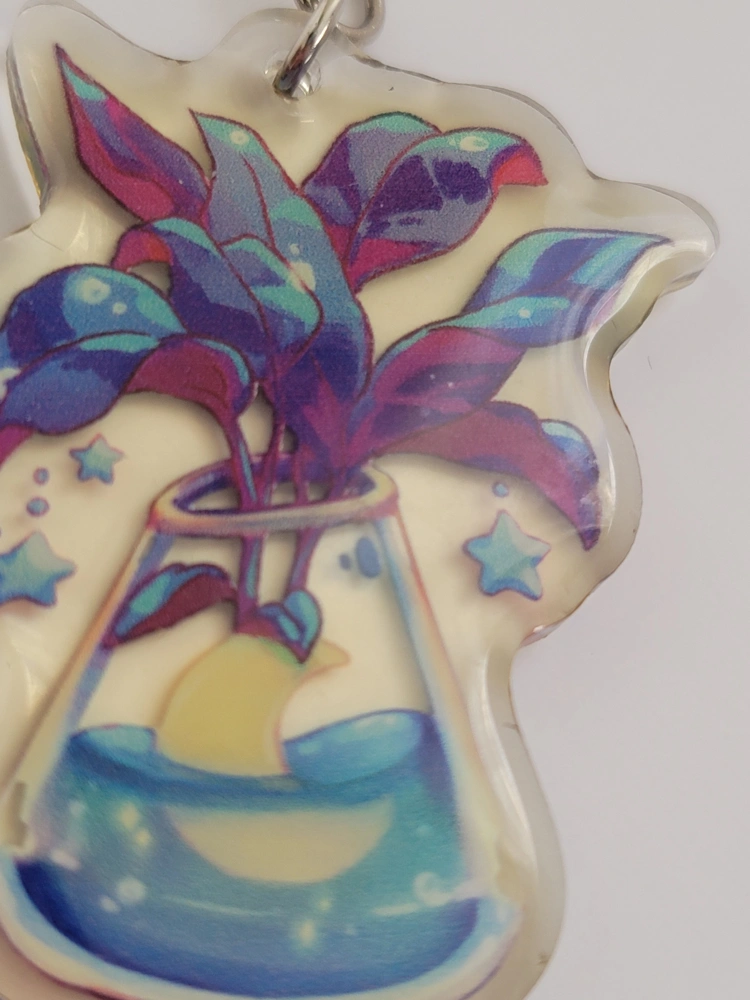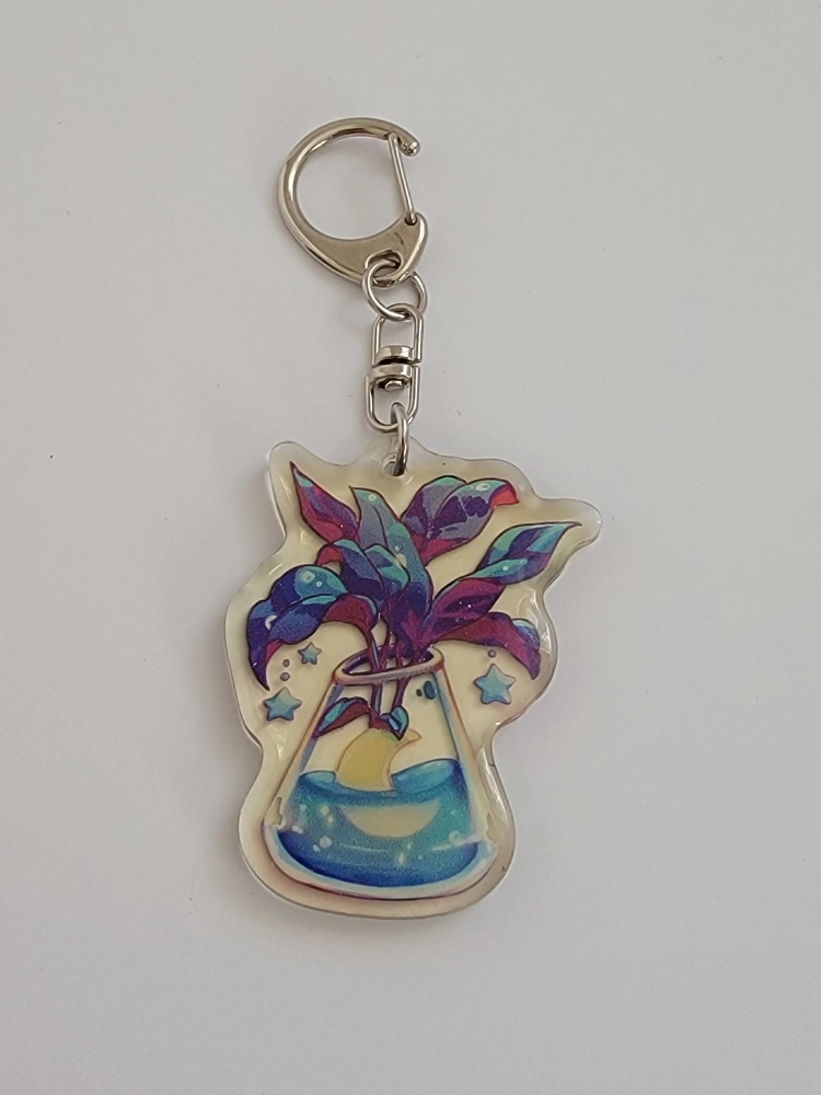 Cute plant in beaker keychain! The plant has purple and green leaves and is in a beaker filled with blue liquid and a moon. It's in great condition!