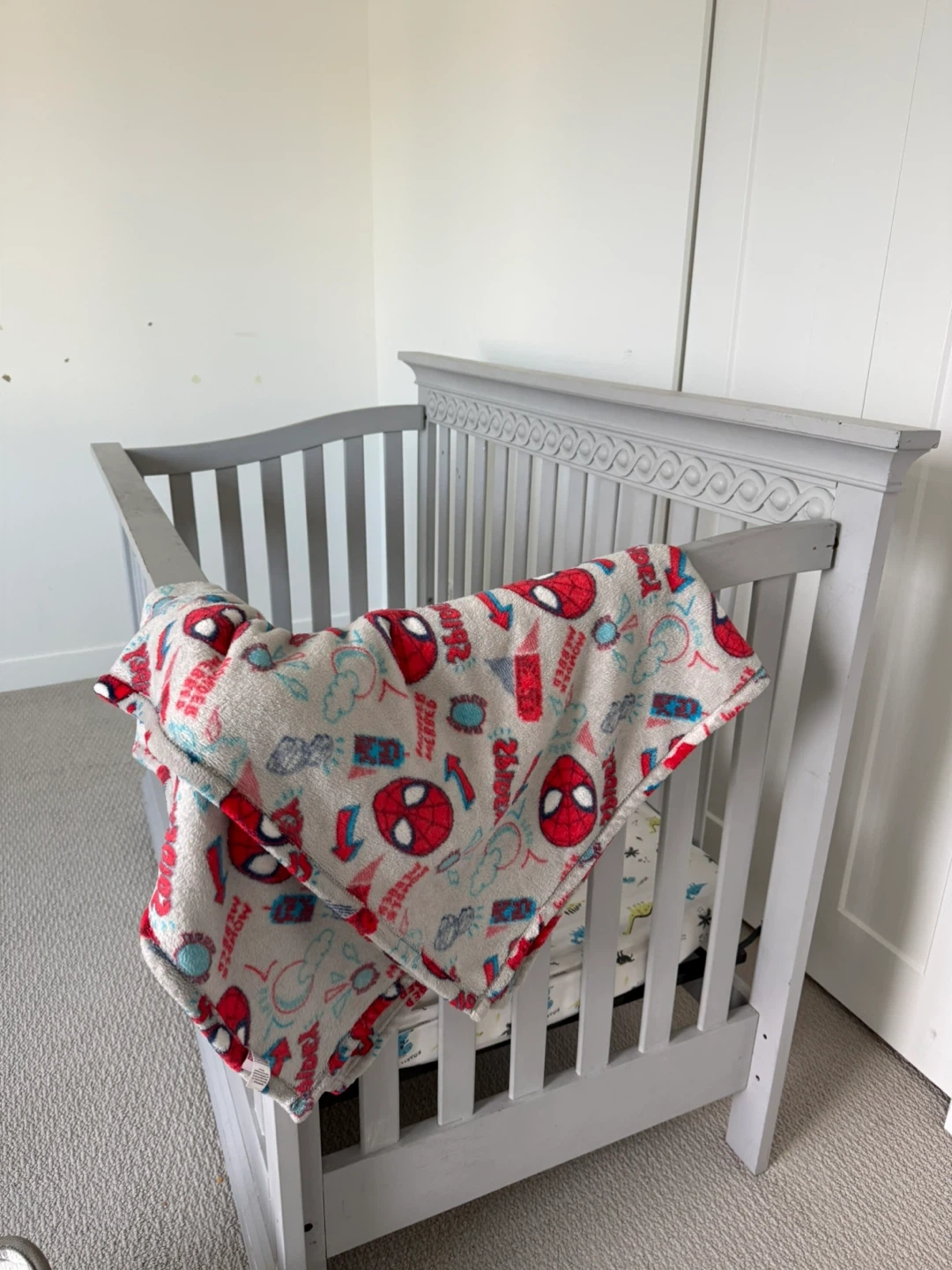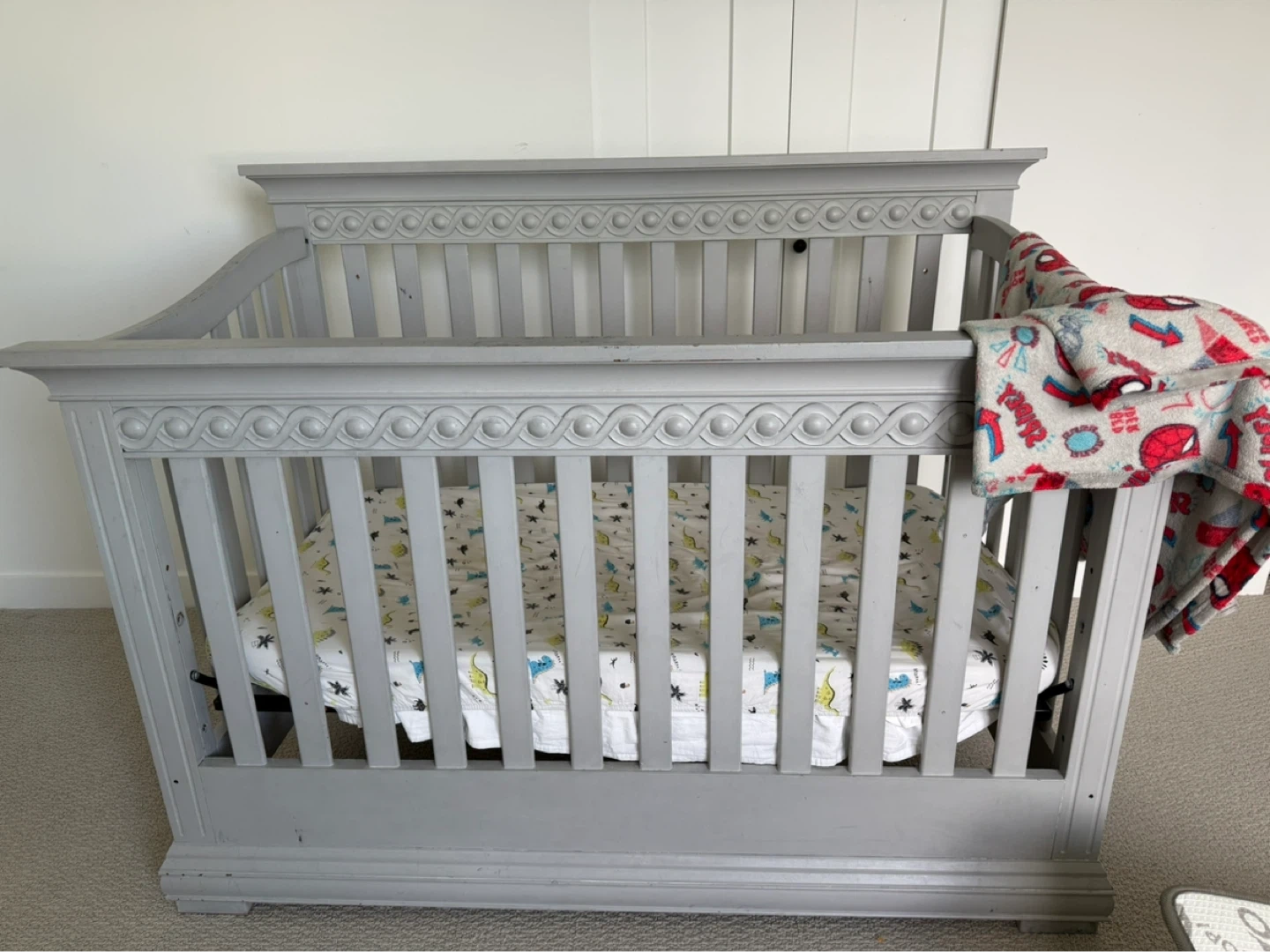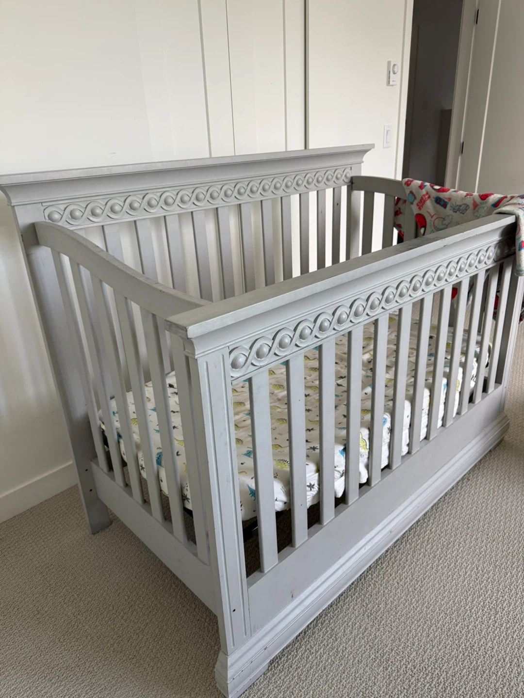 Grey convertible crib with ornate detailing. Converts from crib to todler bed with side rail ( one screw missing )