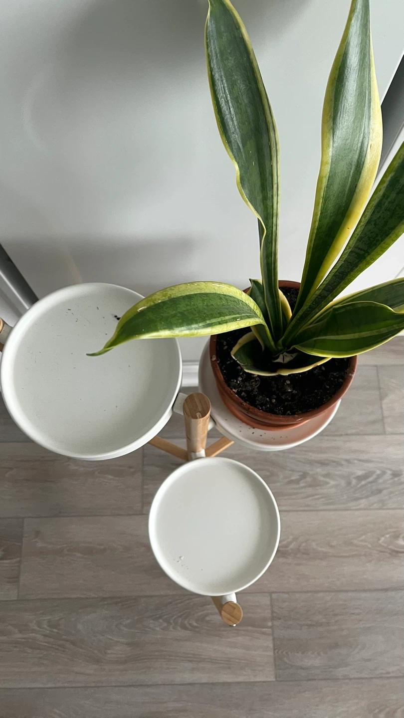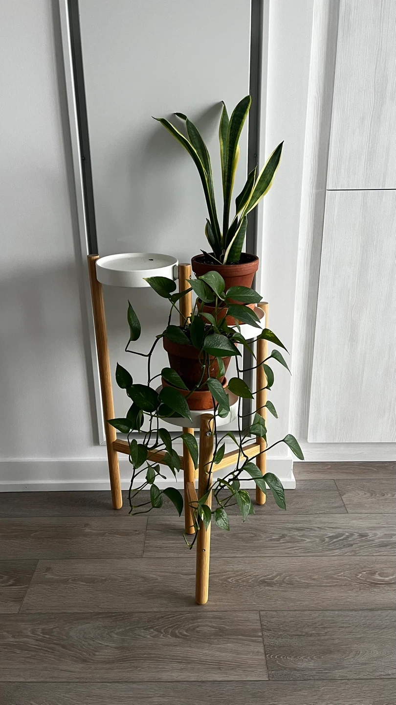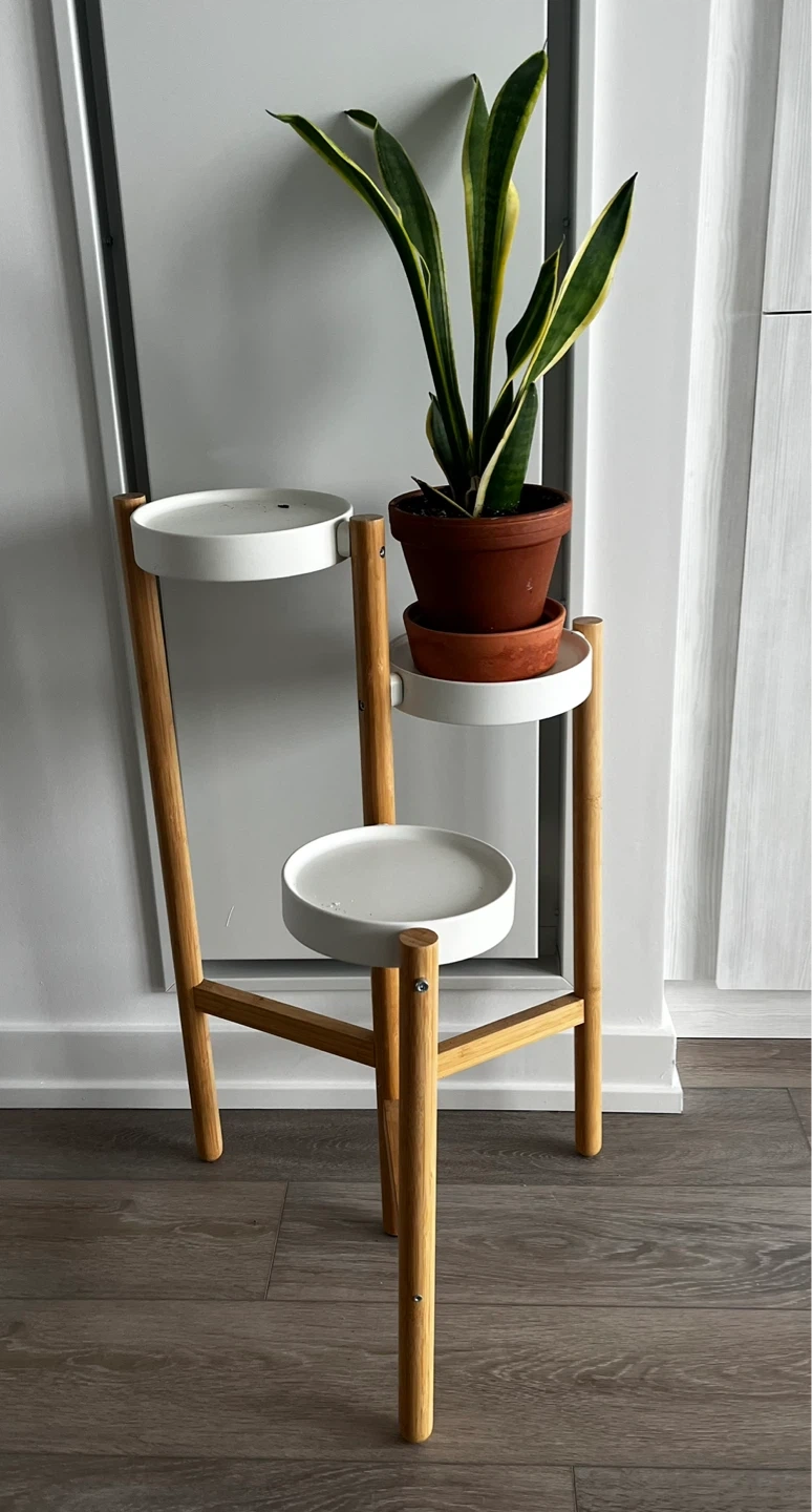 Three-tiered plant stand with a modern design. Features white circular shelves and a light wood frame. It's 78 cm (30 3/4") tall. Perfect for showcasing your favourite plants!