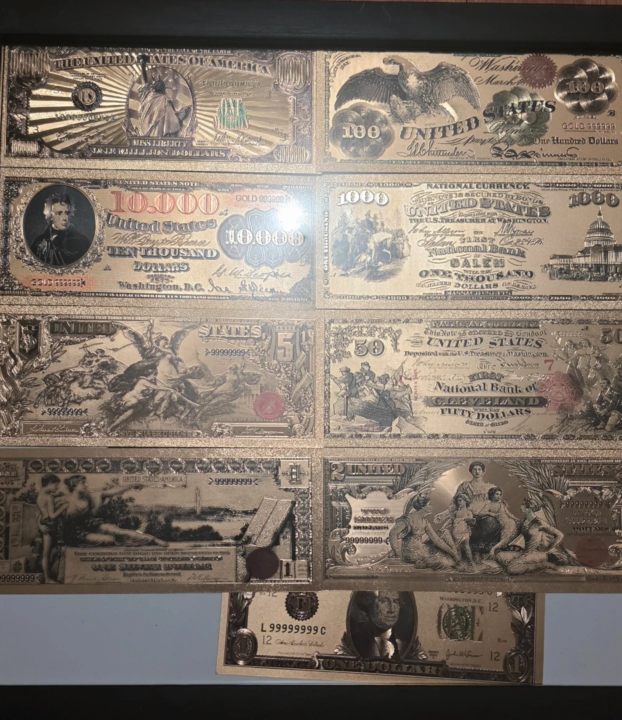 This is a collection of gold plated replicas of various United States currency bills. It includes designs for $10,000, $1,000, $50, and other denominations. These are novelty items and not actual currency. This is for decorating look