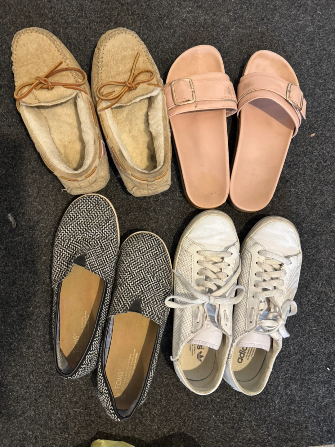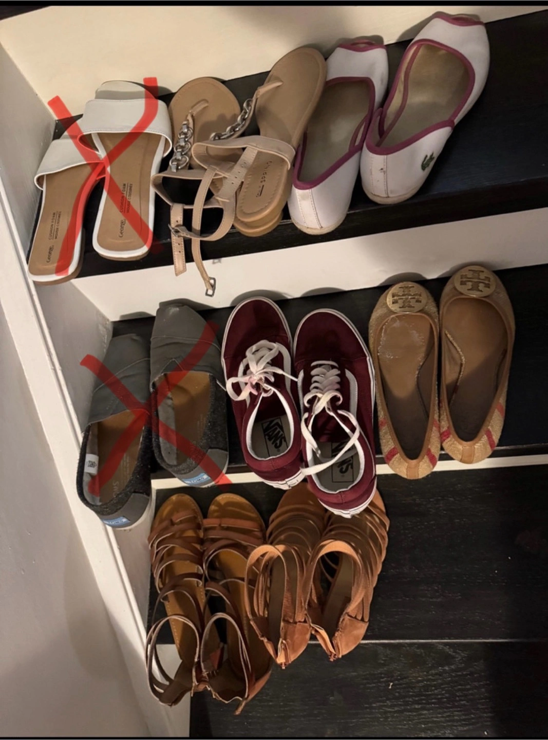 Large bundle of women's shoes, various styles and sizes. Includes flats, sandals, sneakers, and slip-ons. Brands include Vans, TOMS, Adidas, and Lacoste. Tory Burch etc. Pre-owned, some wear and tear expected.