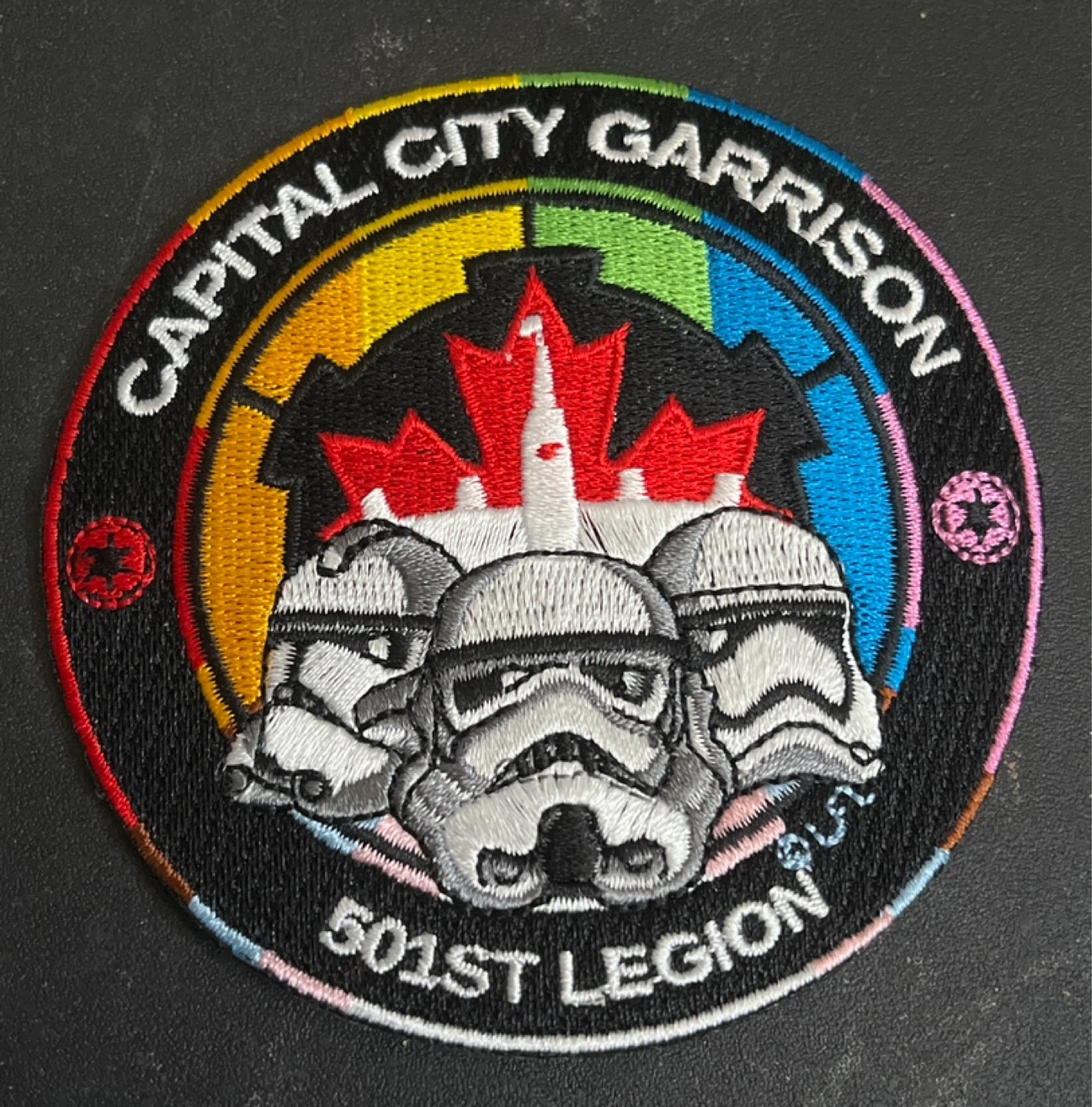 This embroidered patch features the Capital City Garrison of the 501st Legion. It includes a rainbow background with a Canadian maple leaf and three Stormtrooper helmets. Measures approximately 4 inches in diameter.
