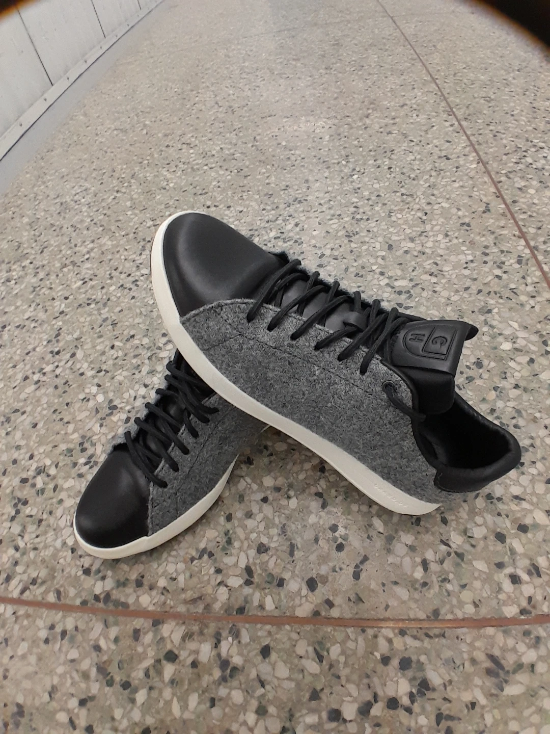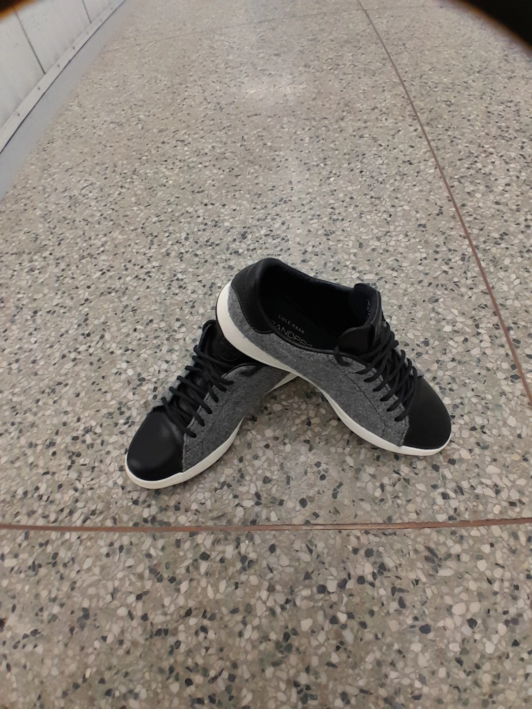 Cole Haan GrandPrø sneakers are crafted from a blend of grey felt and black leather. They feature a classic lace-up closure and a durable white sole. They're great for everyday wear! Men's Size 9.