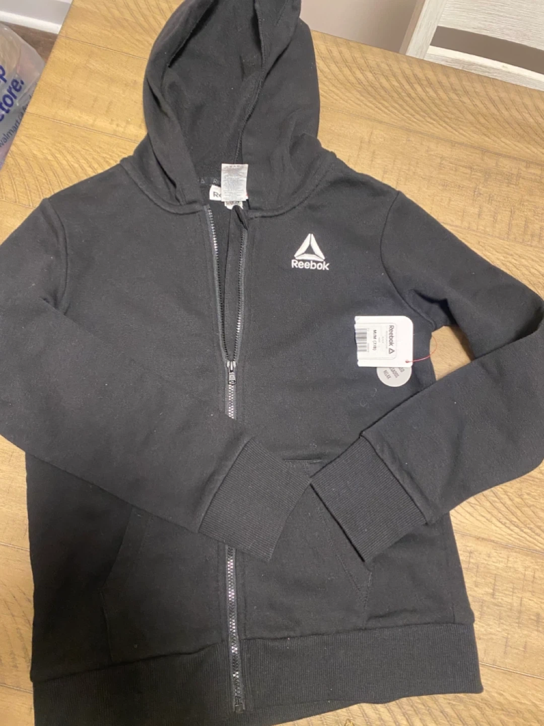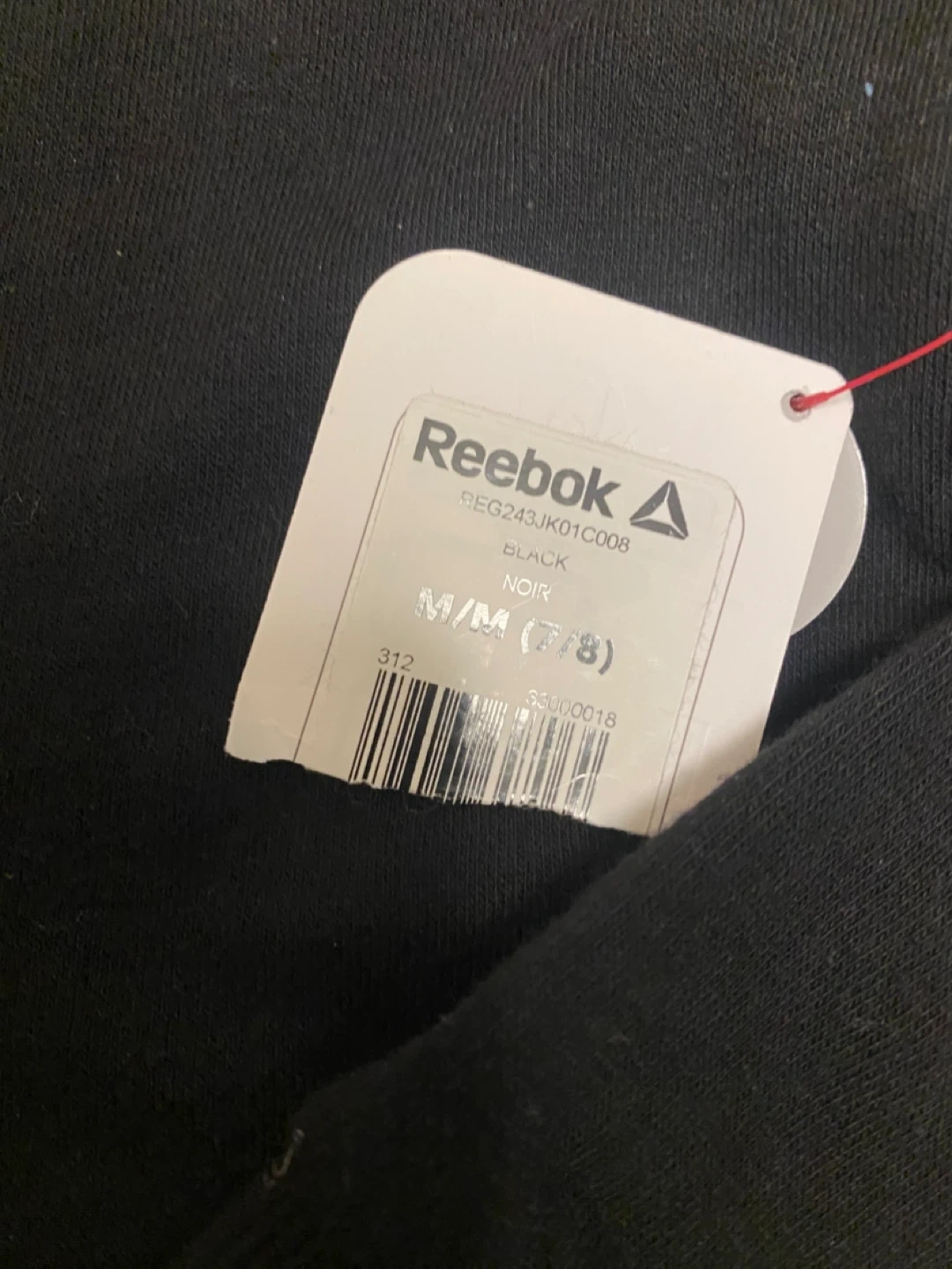This is a black zip-up hoodie from Reebok. It's a size M/M, which corresponds to a youth size 7/8. Made with soft material for comfort.