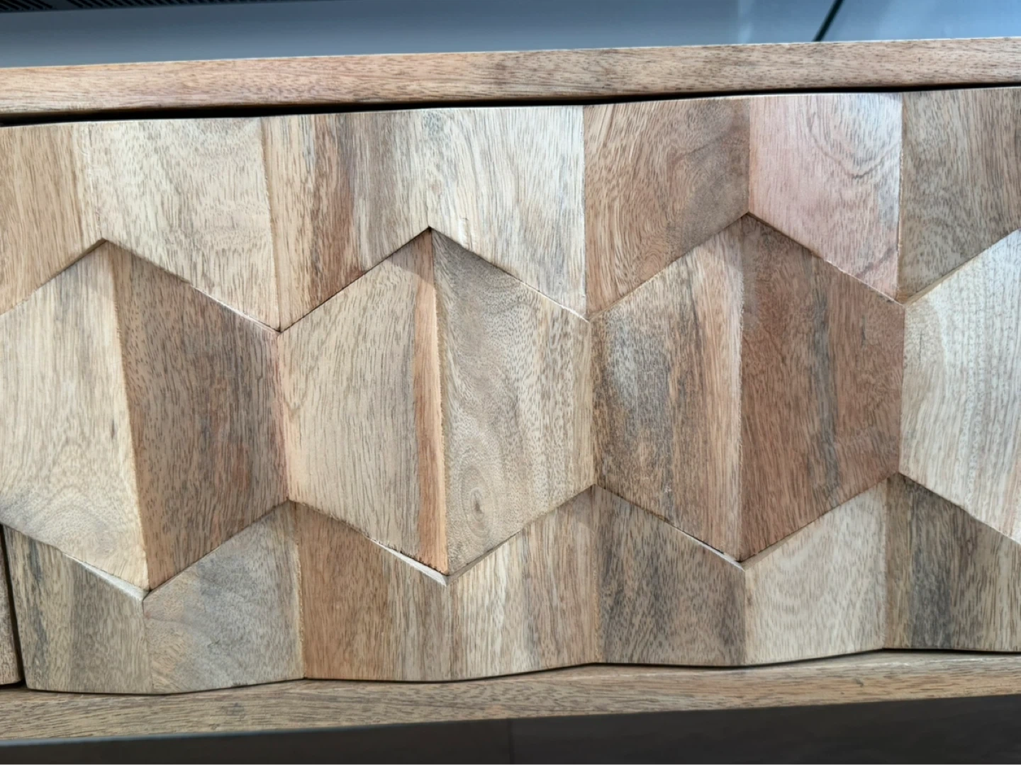 Selling our beloved Swoon tv stand. This media console is the Swoon Editions Zabel Media Unit, featuring a hand-carved hexagonal pattern on solid mango wood doors. It’s in very good condition, just a couple minor scratches, as shown in photos.
