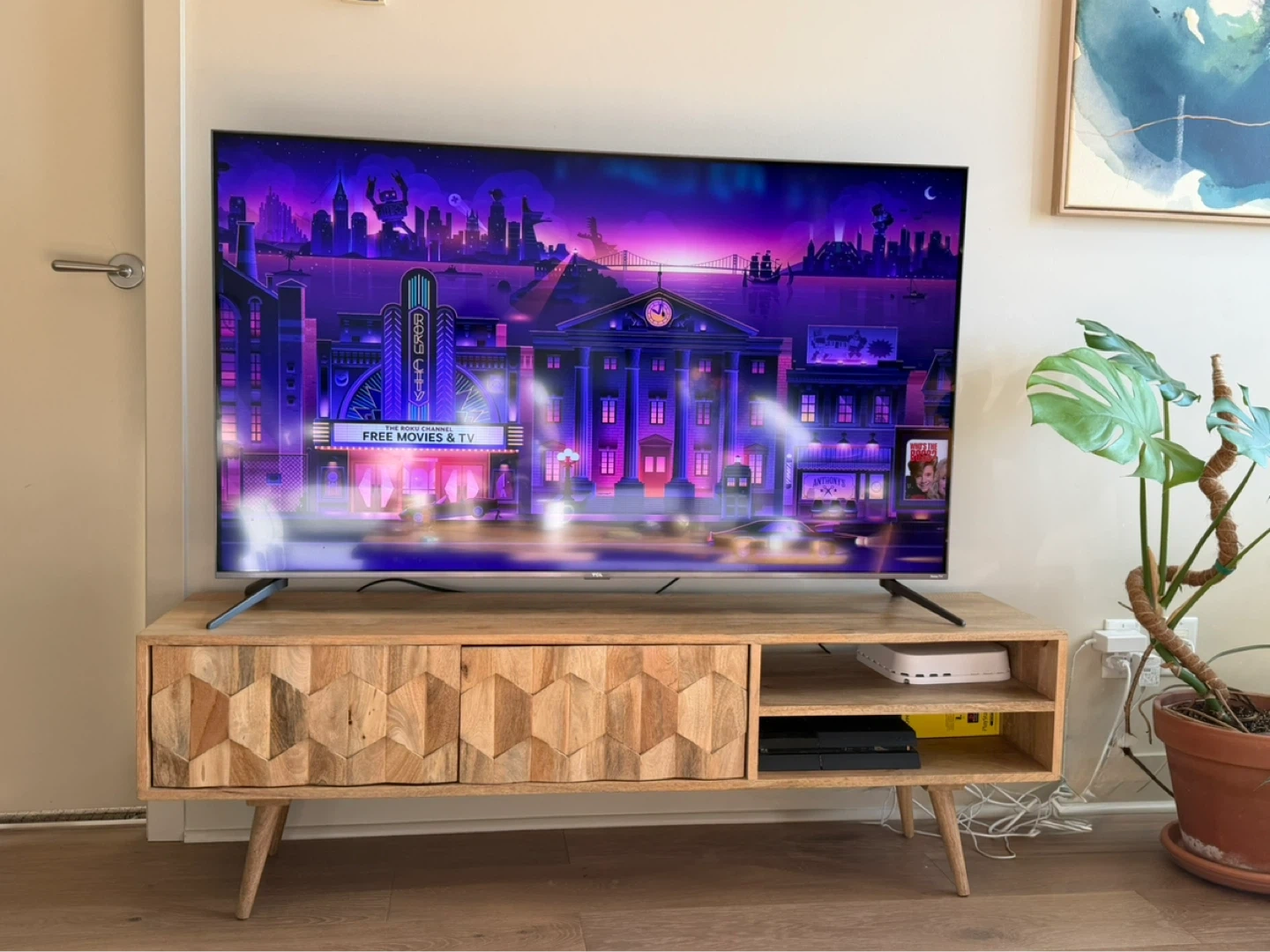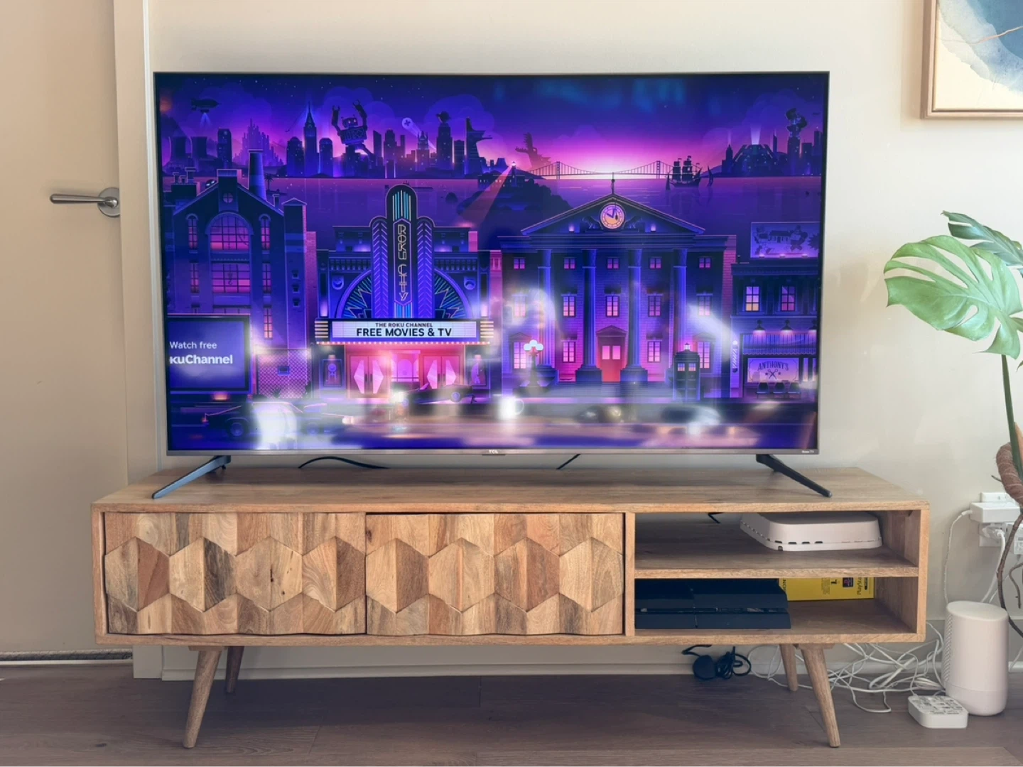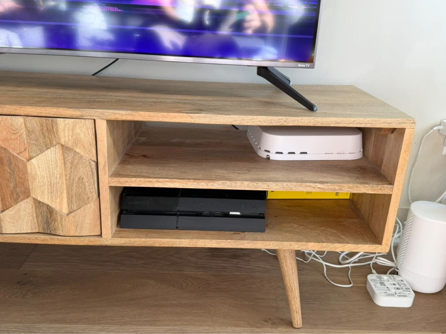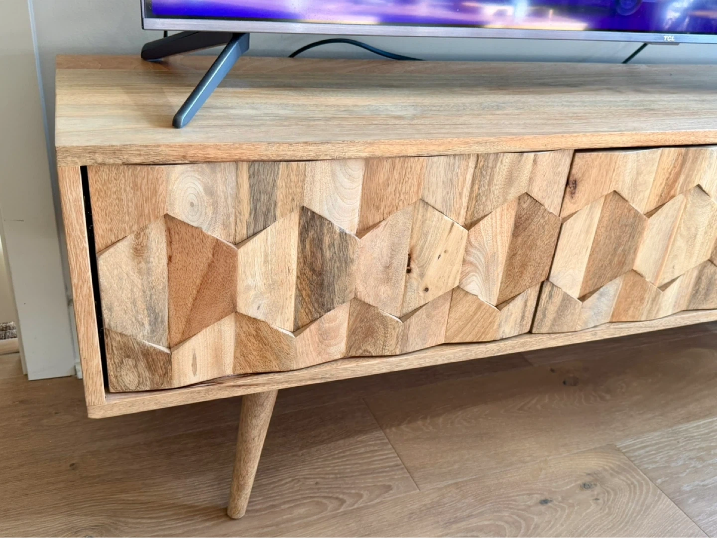 Selling our beloved Swoon tv stand. This media console is the Swoon Editions Zabel Media Unit, featuring a hand-carved hexagonal pattern on solid mango wood doors. It’s in very good condition, just a couple minor scratches, as shown in photos.