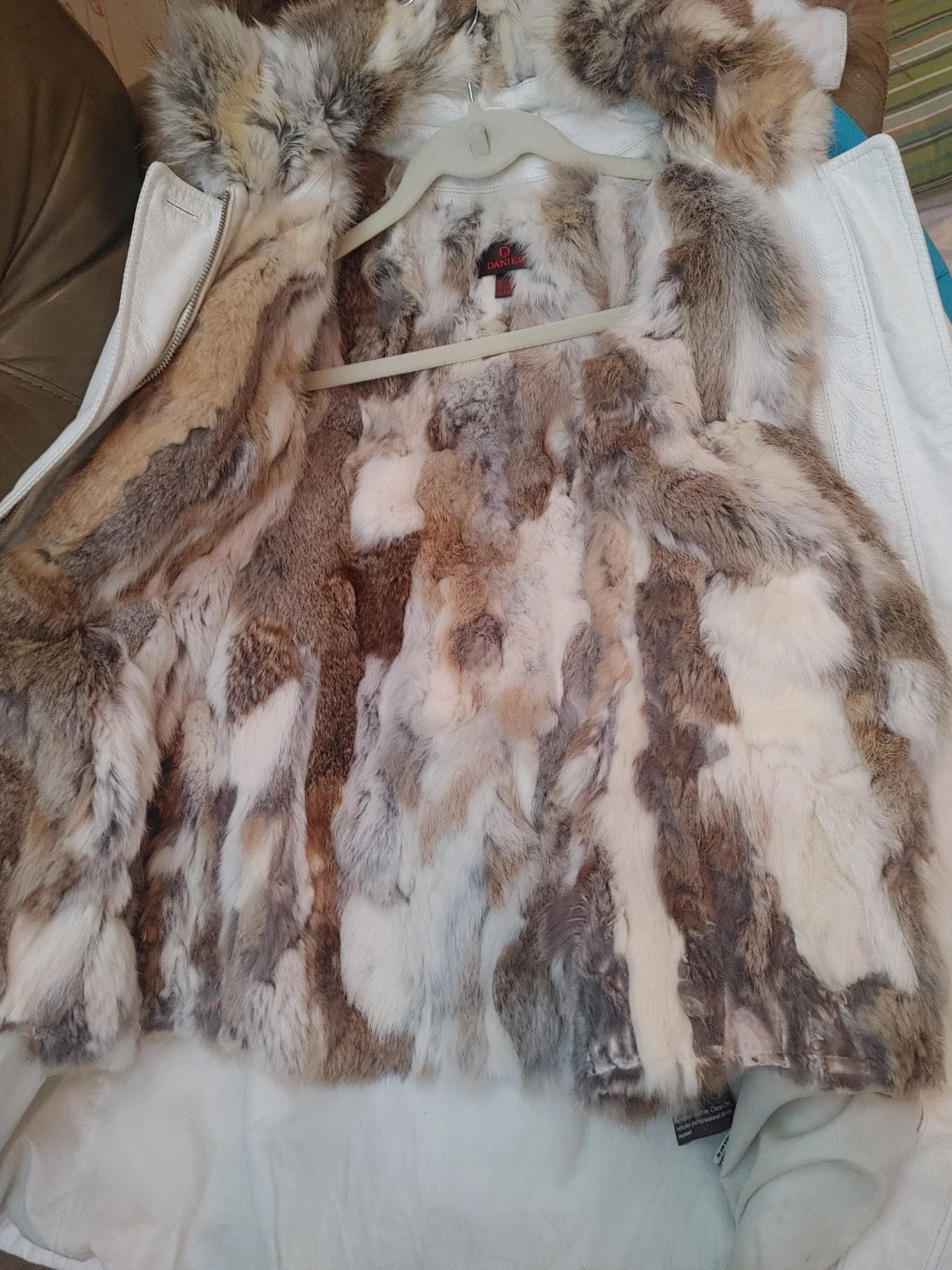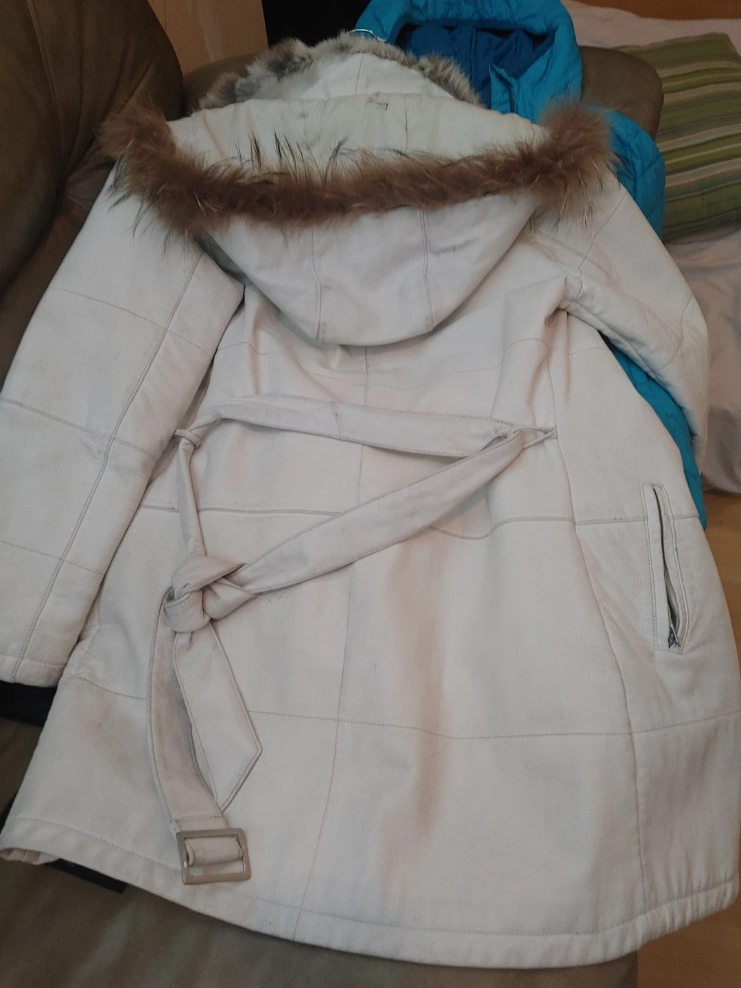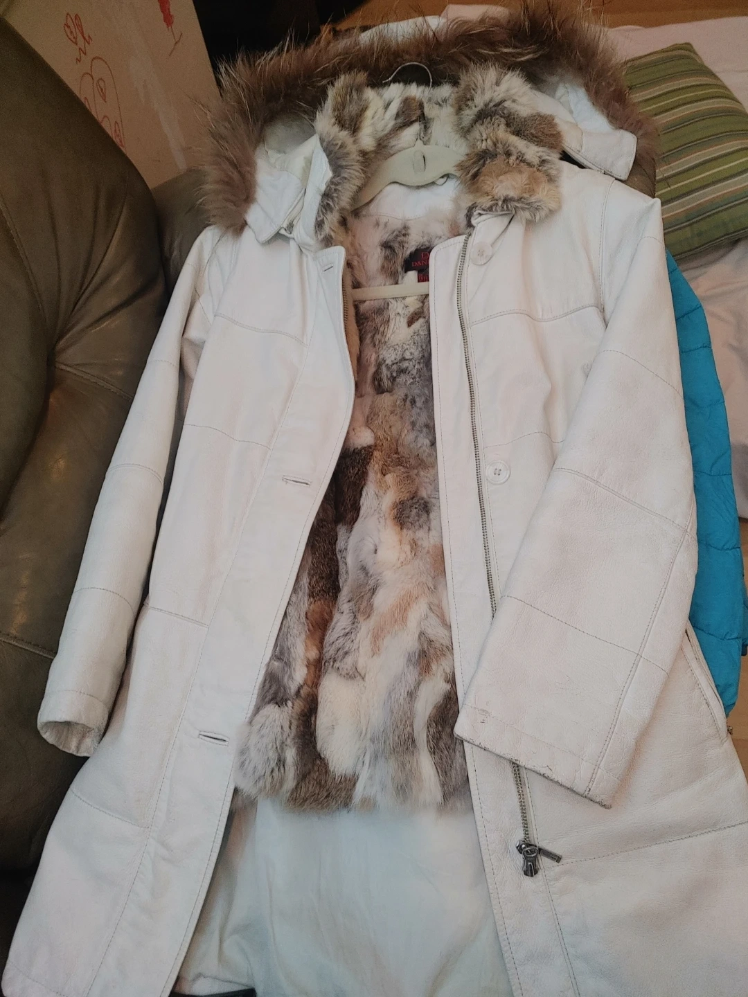 This white leather parka features a cozy fur lining and a fur-trimmed hood. It's a stylish and warm option for colder weather. The jacket is made of leather with a soft fur interior. Interior and hood are removable. Could use a cleaning (dry cleaners only)