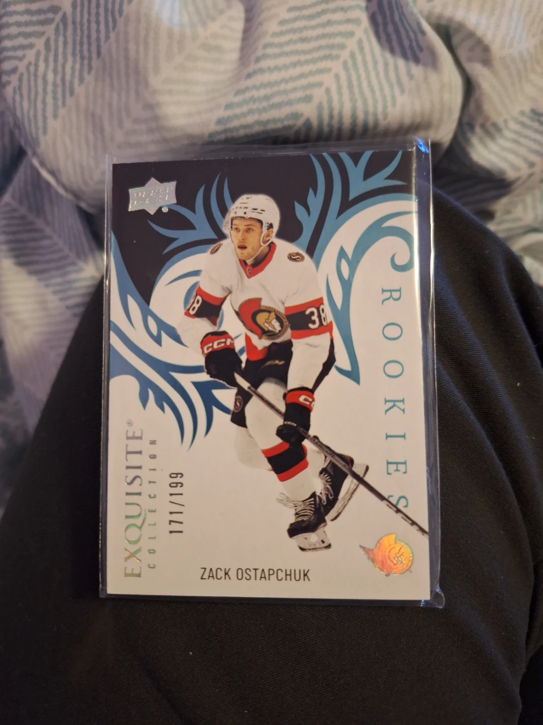 This is a 2023-24 Upper Deck Exquisite Collection Rookies hockey card featuring Zack Ostapchuk. It's part of the "ROOKIES" series, numbered 171/199. The card displays Zack Ostapchuk's stats and biographical information.