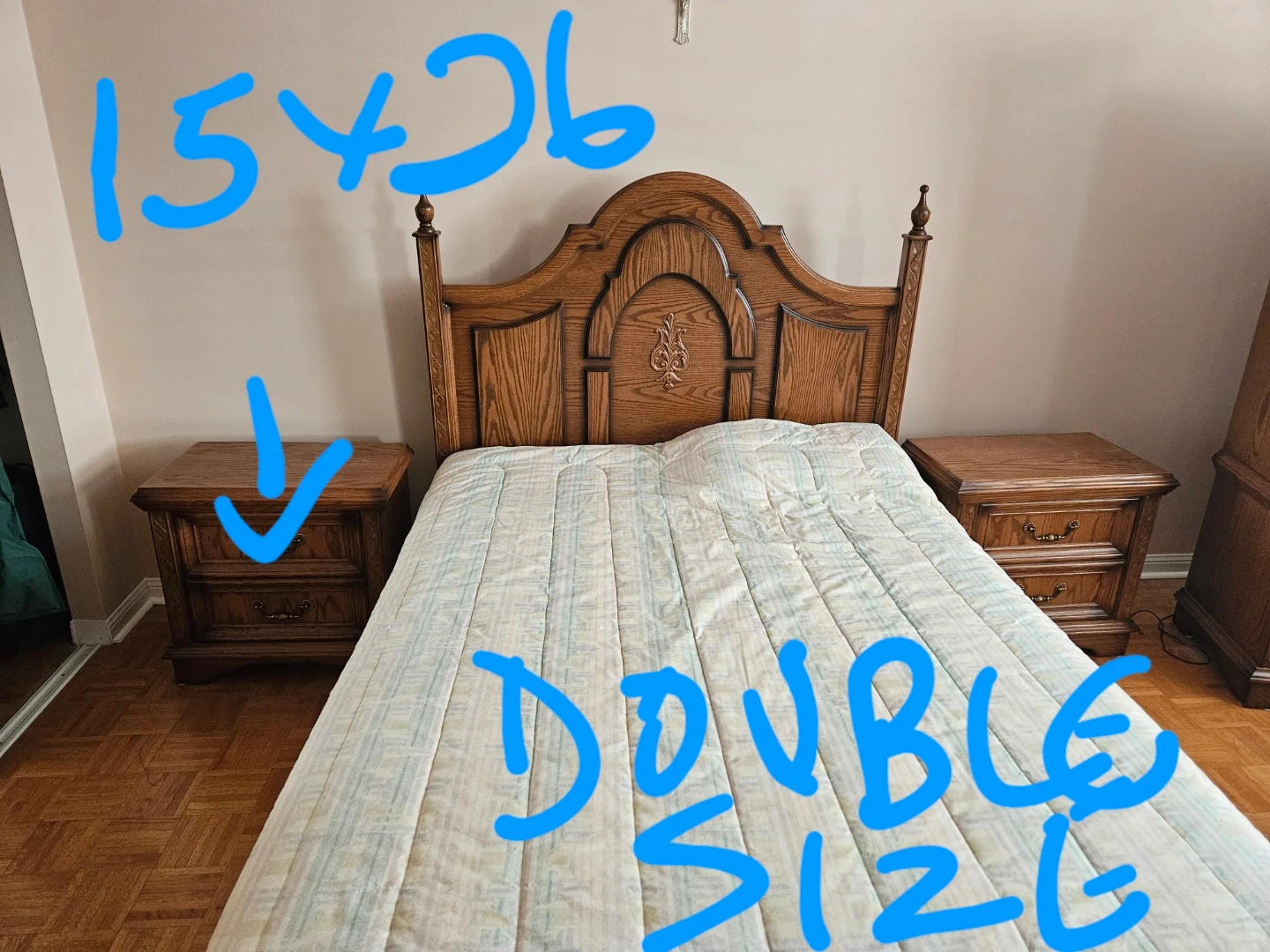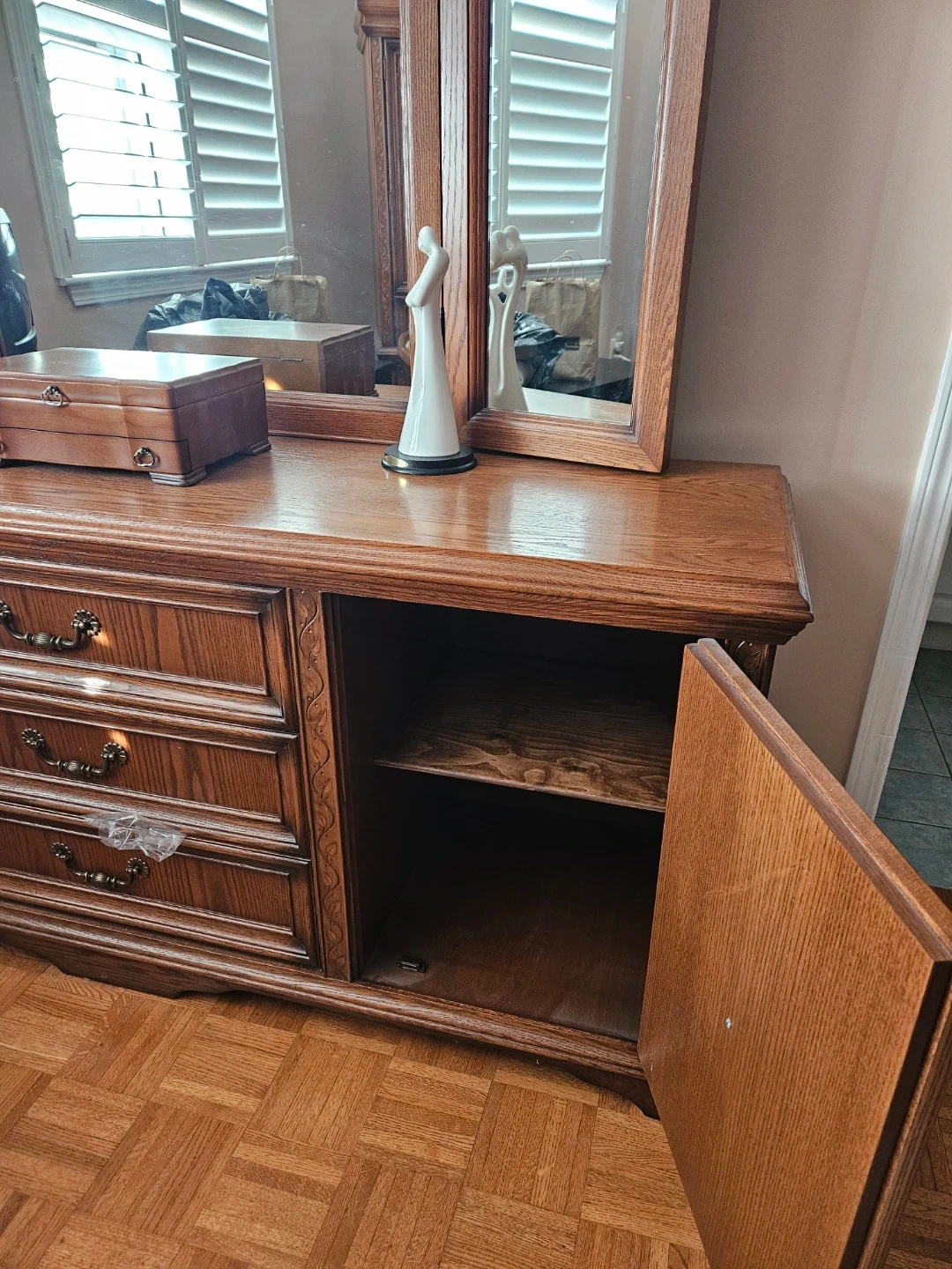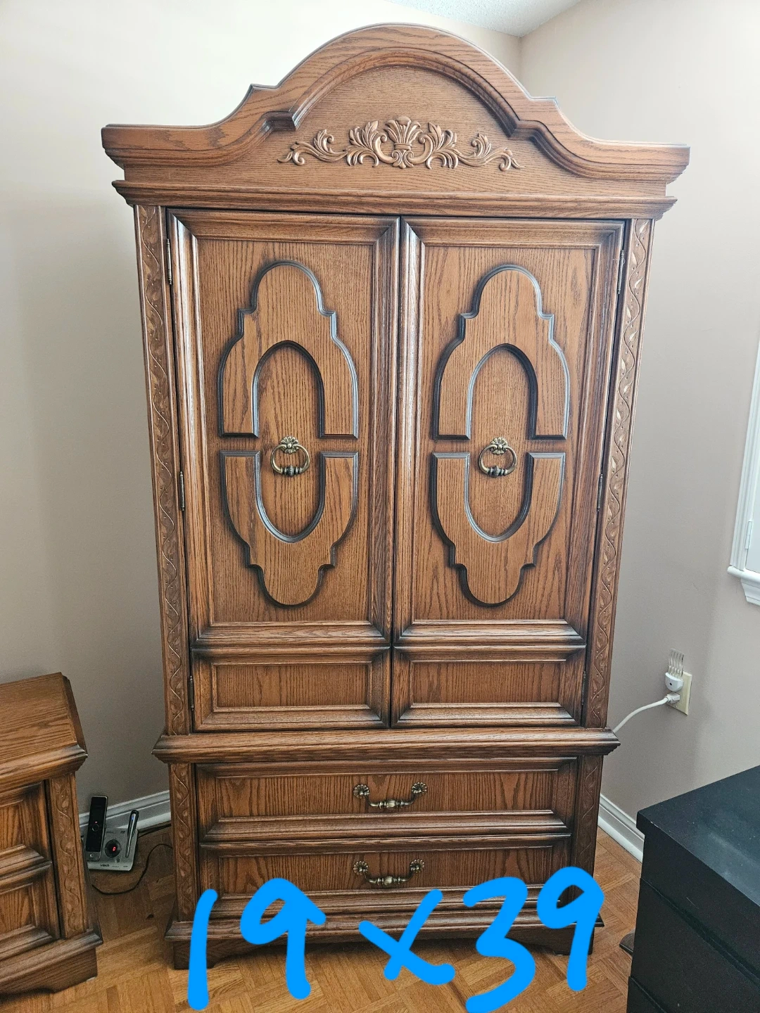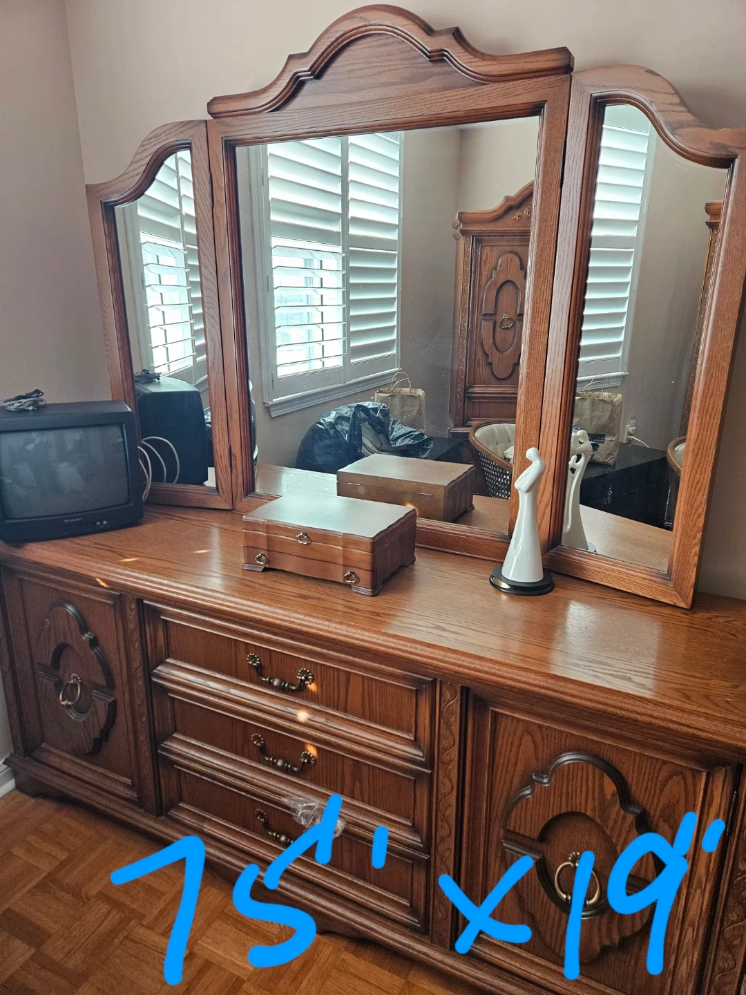 This is a solid wood bedroom furniture set. It includes a large wardrobe, a dresser with a tri-fold mirror, and two matching nightstands. The wood is a warm oak tone with ornate detailing. The dresser measures 75" x 19". The wardrobe is 39" x 19".