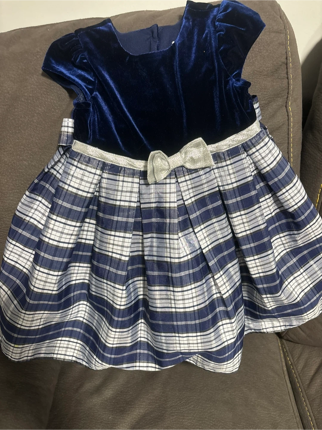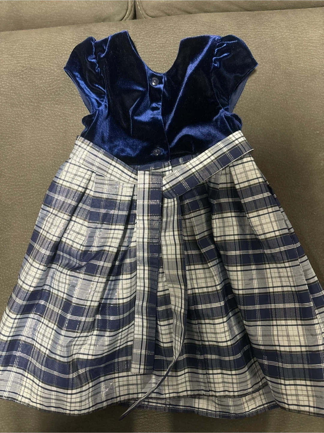 A cute Jona Michelle dress, size 3! It features a navy blue velvet top and a plaid skirt. Perfect for a special occasion or just looking adorable!