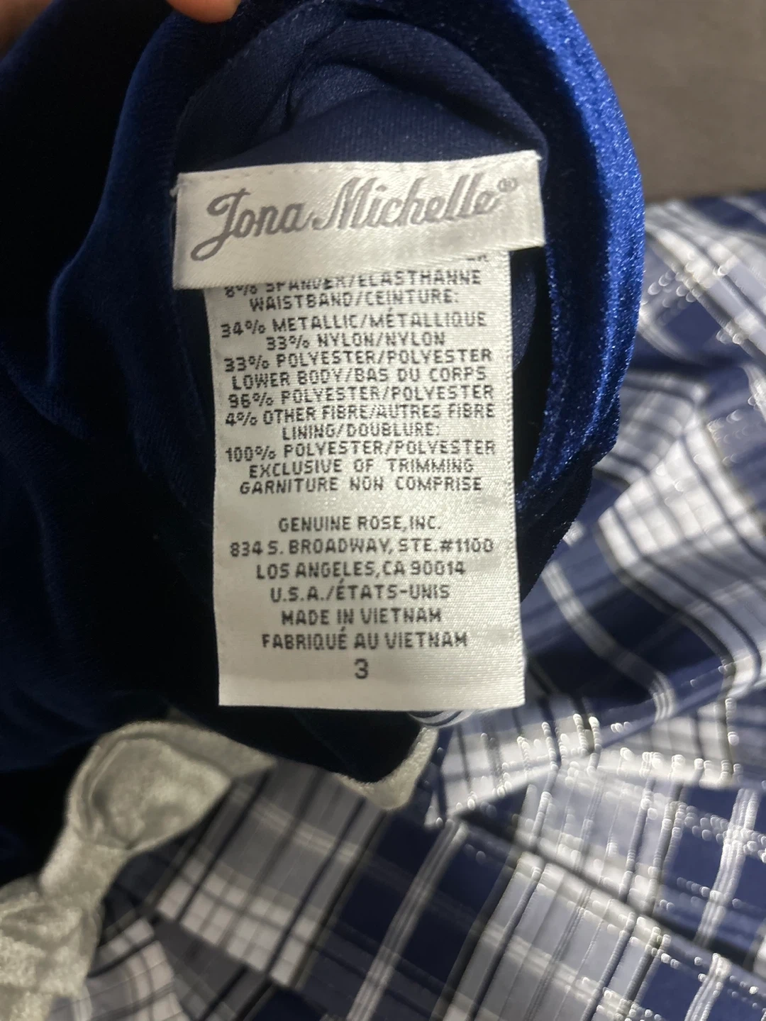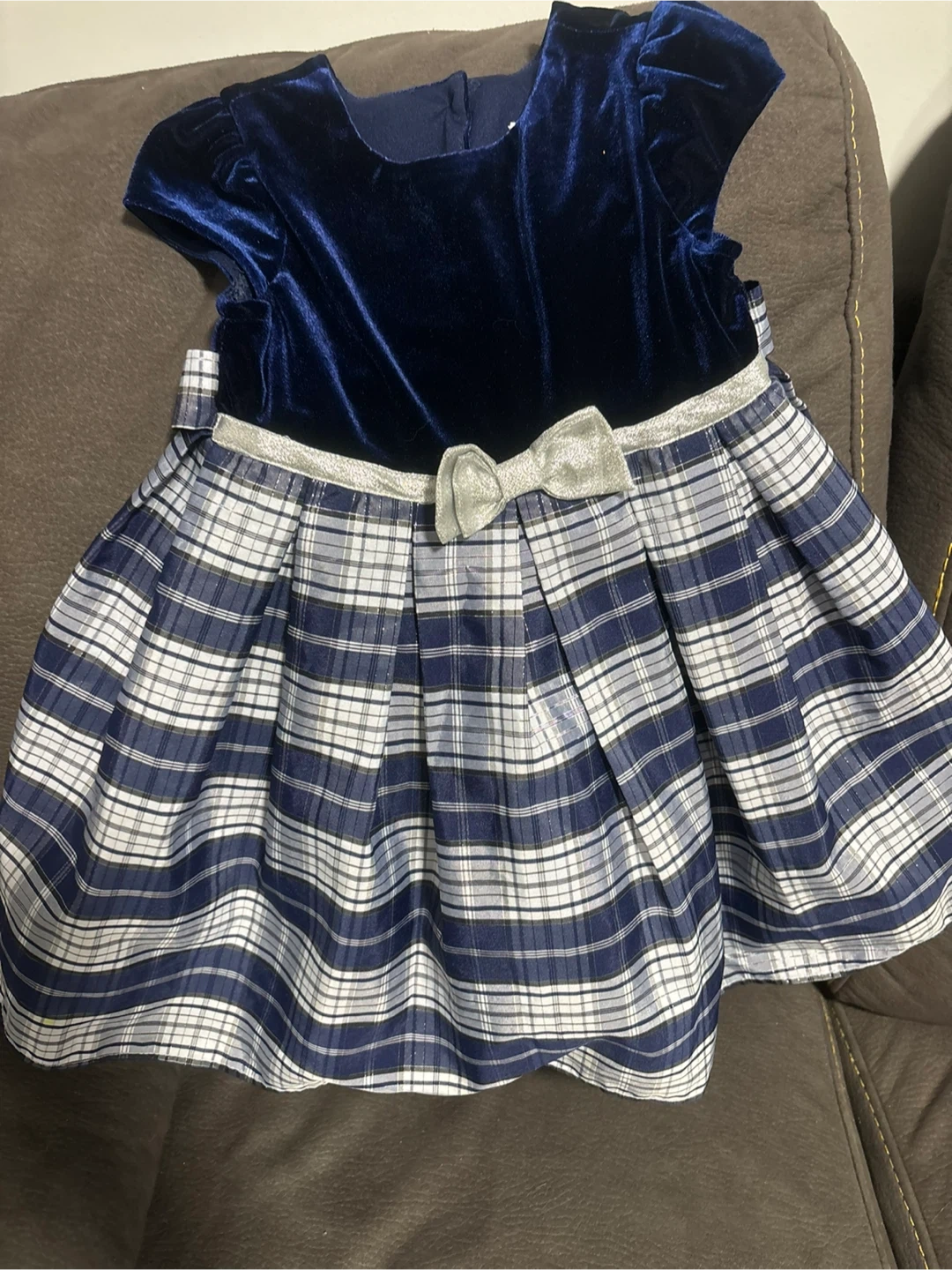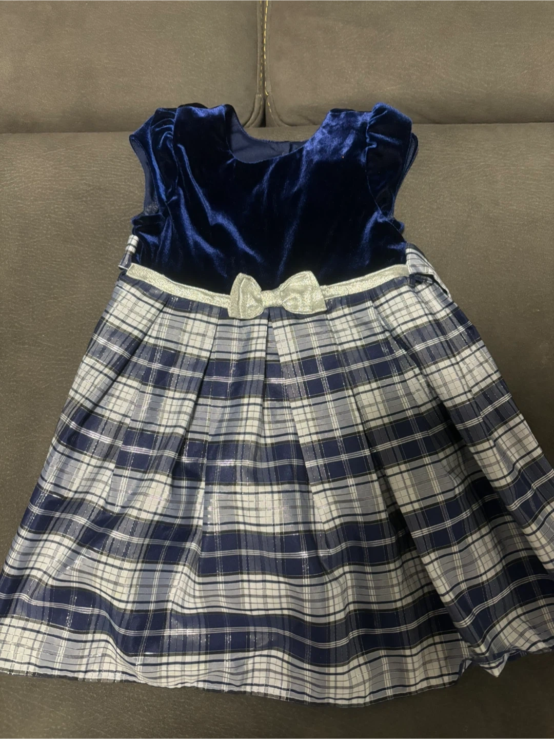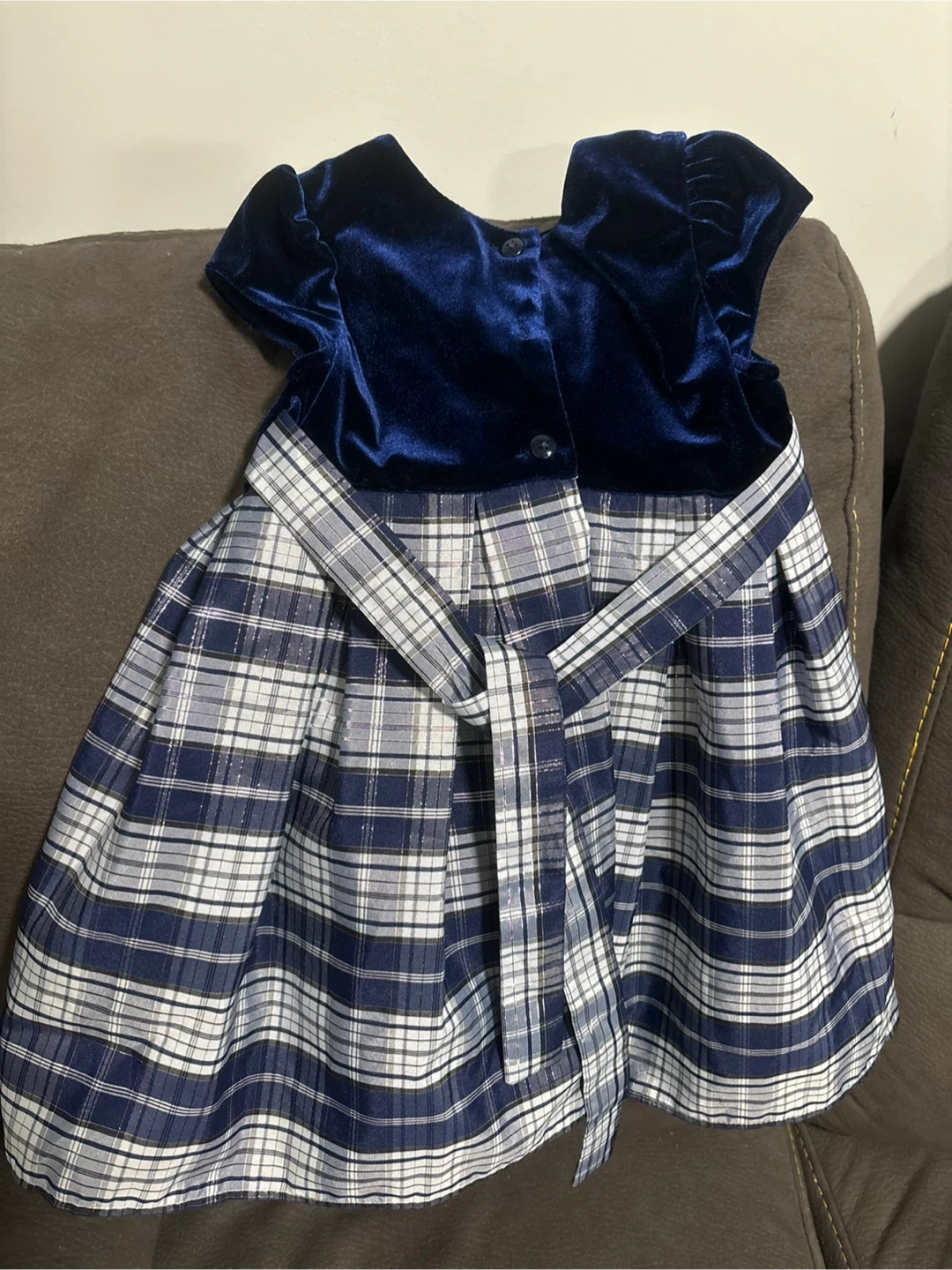 A cute Jona Michelle dress, size 3! It features a navy blue velvet top and a plaid skirt. Perfect for a special occasion or just looking adorable!