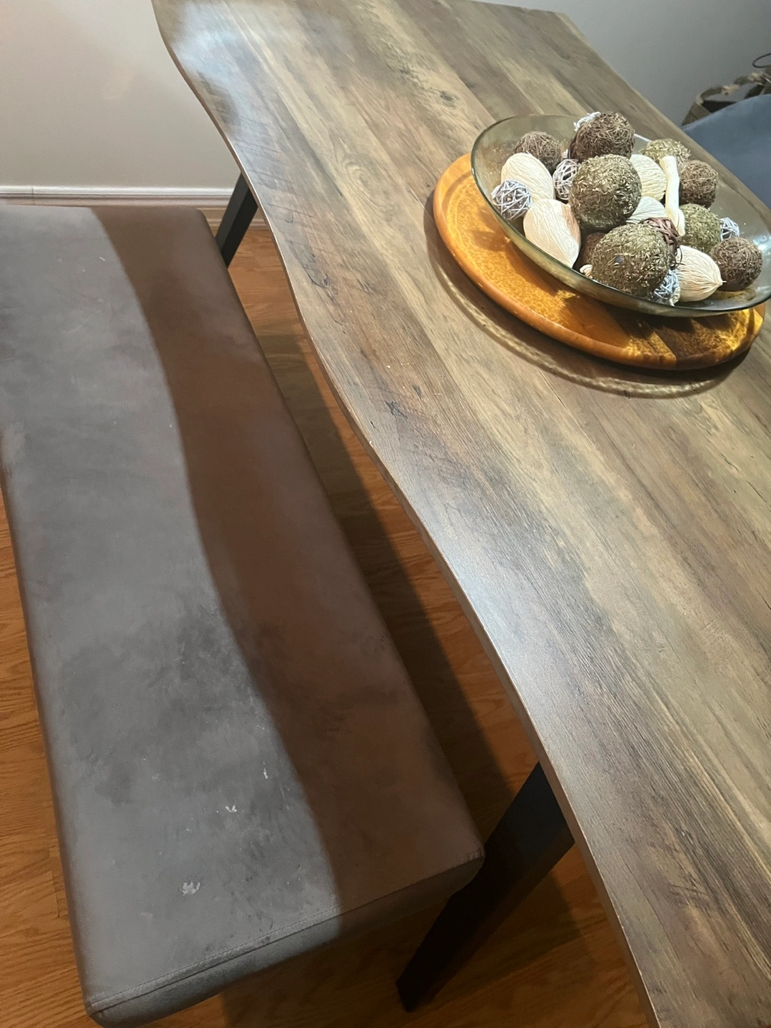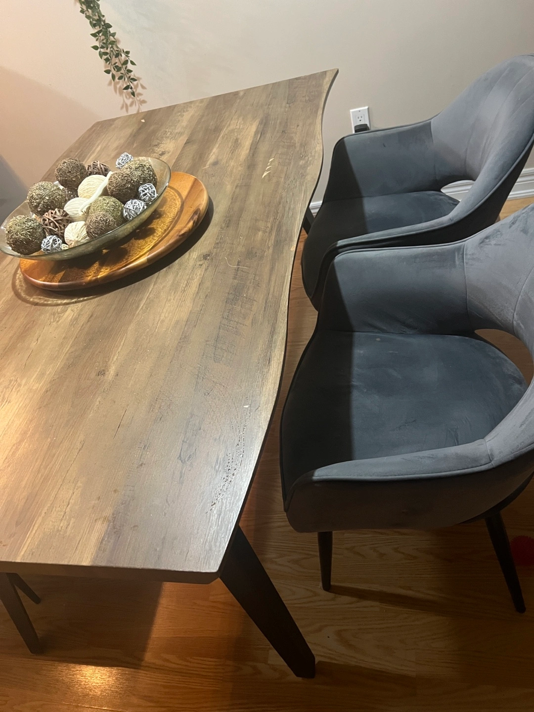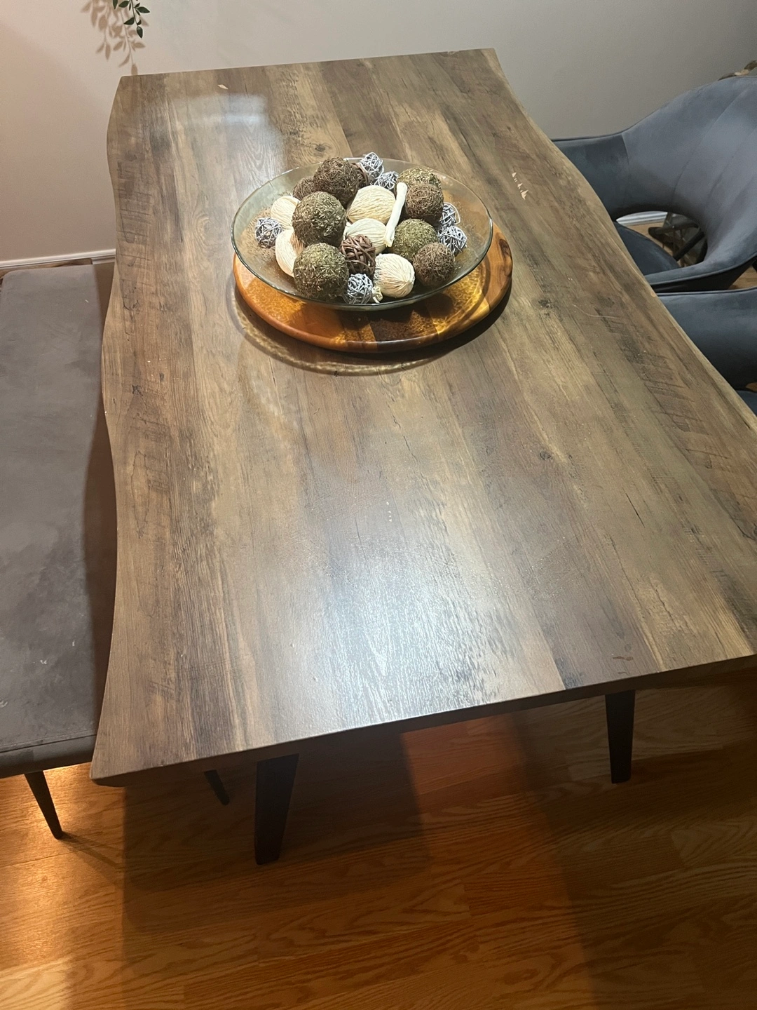 A beautiful rustic wood dining table with a unique live edge. It's perfect for family dinners or entertaining guests. The wood grain pattern adds warmth to any dining space.