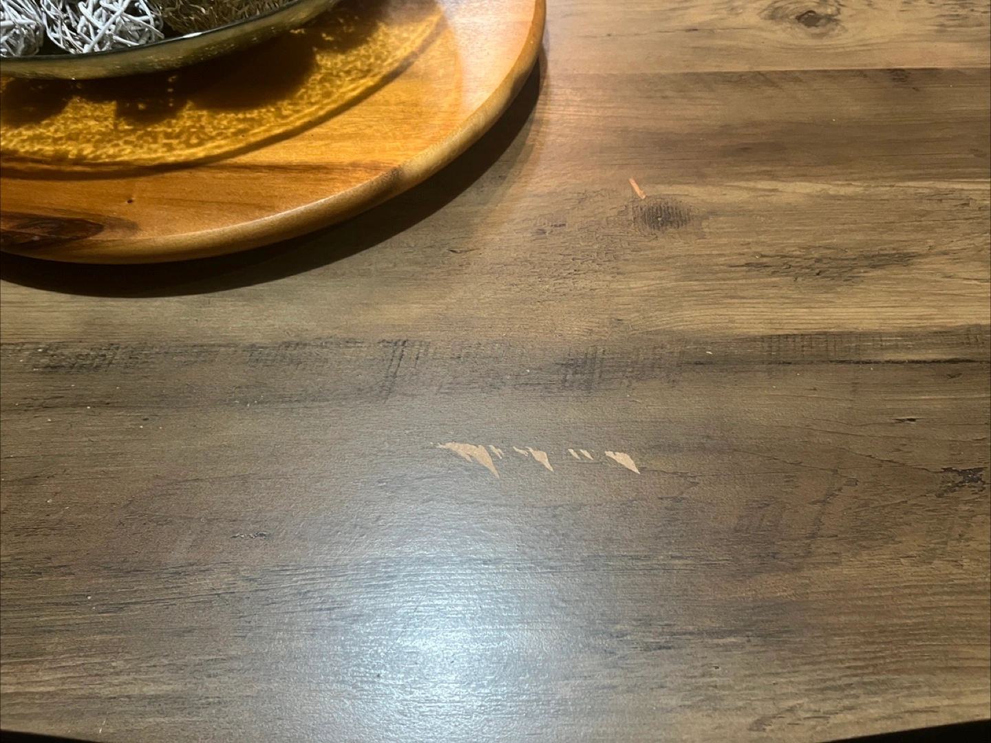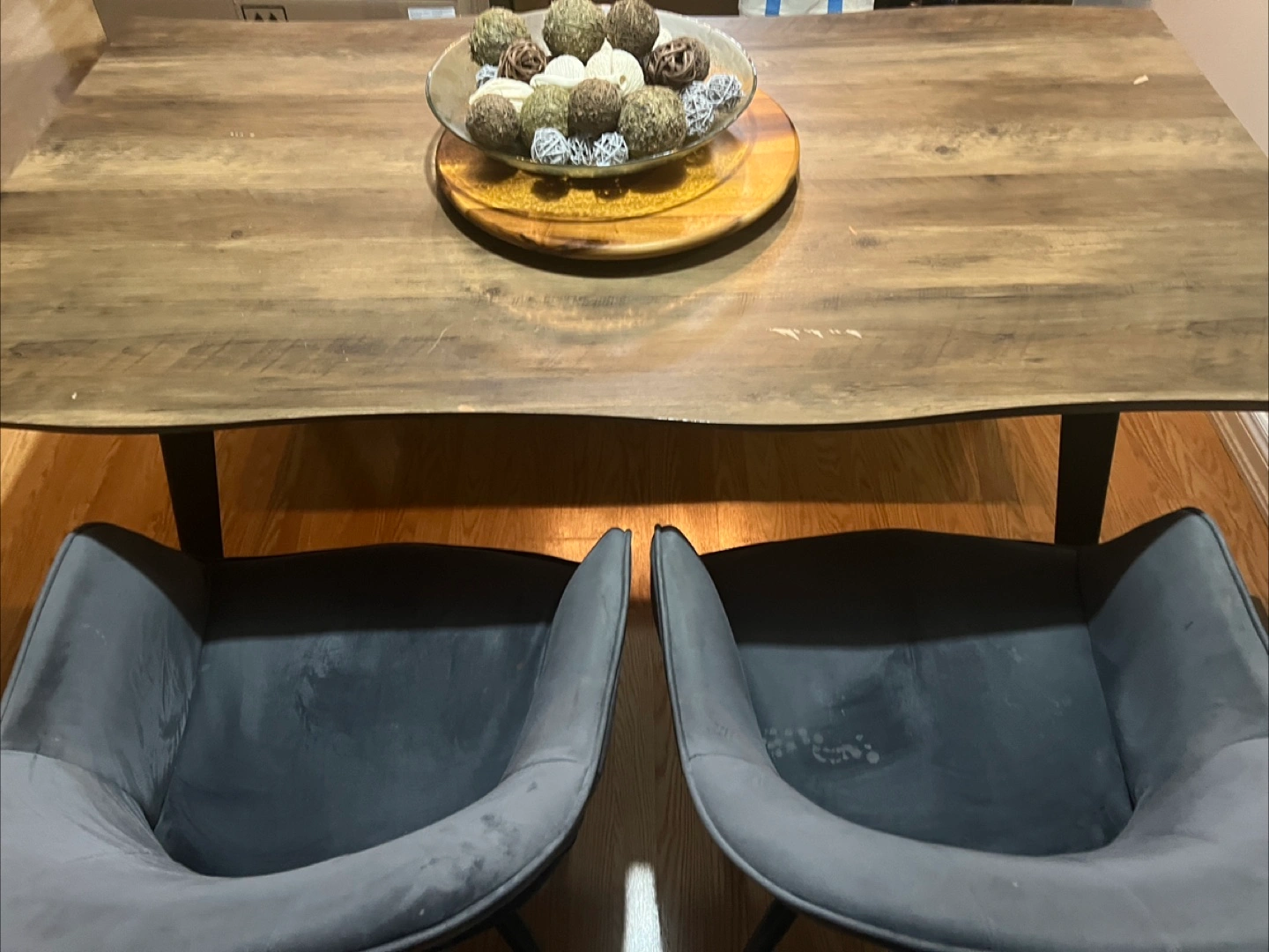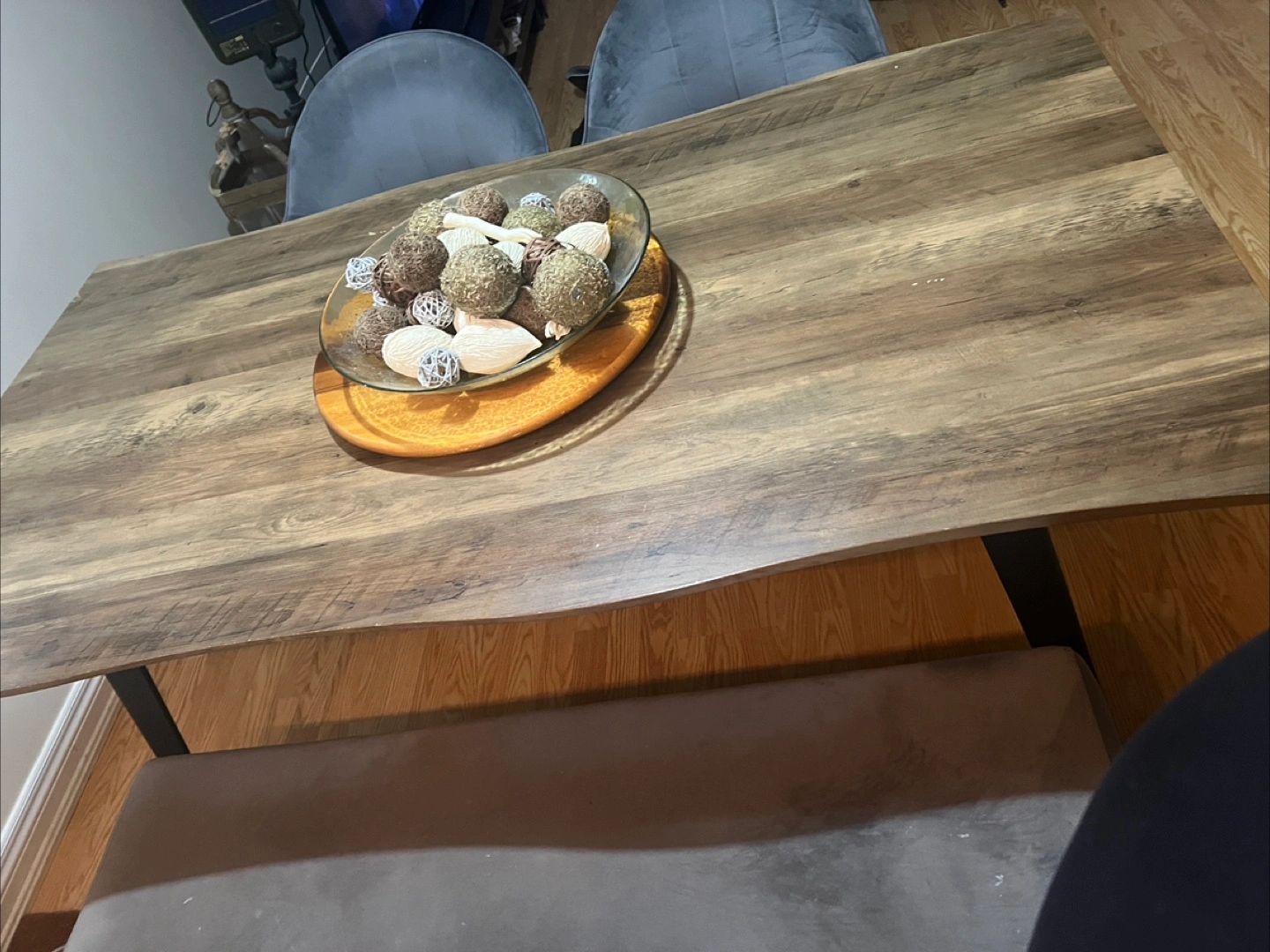 A beautiful rustic wood dining table with a unique live edge. It's perfect for family dinners or entertaining guests. The wood grain pattern adds warmth to any dining space.