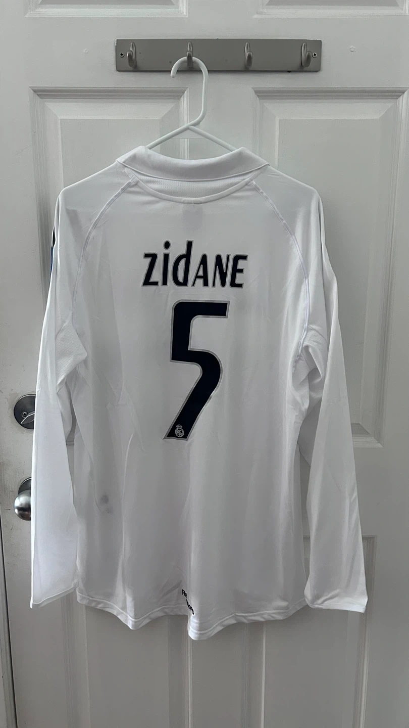 White long-sleeve Adidas Real Madrid jersey with Zidane #5 printed on the back. Features the Siemens sponsor logo on the front. Made from breathable material.