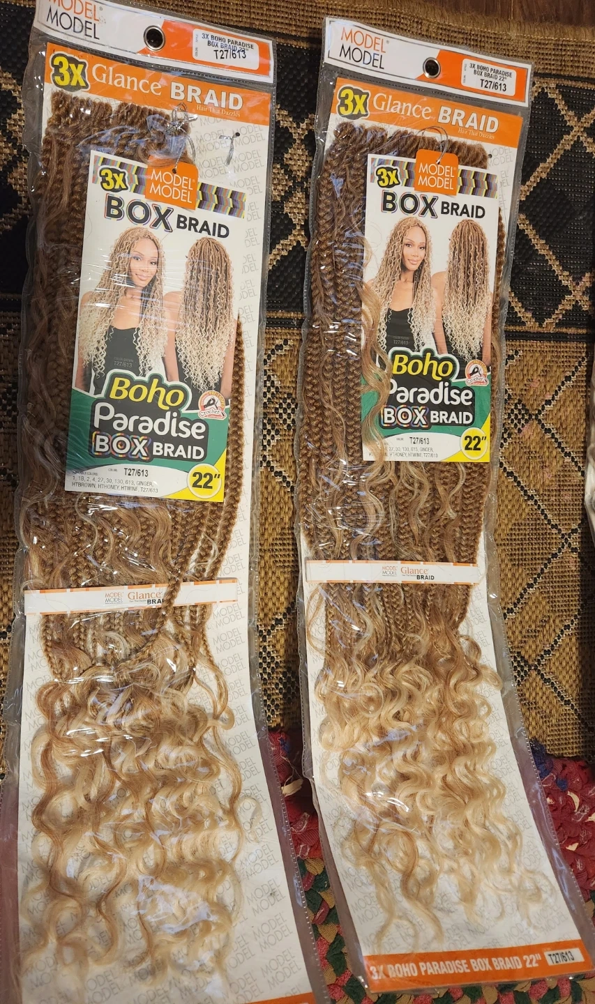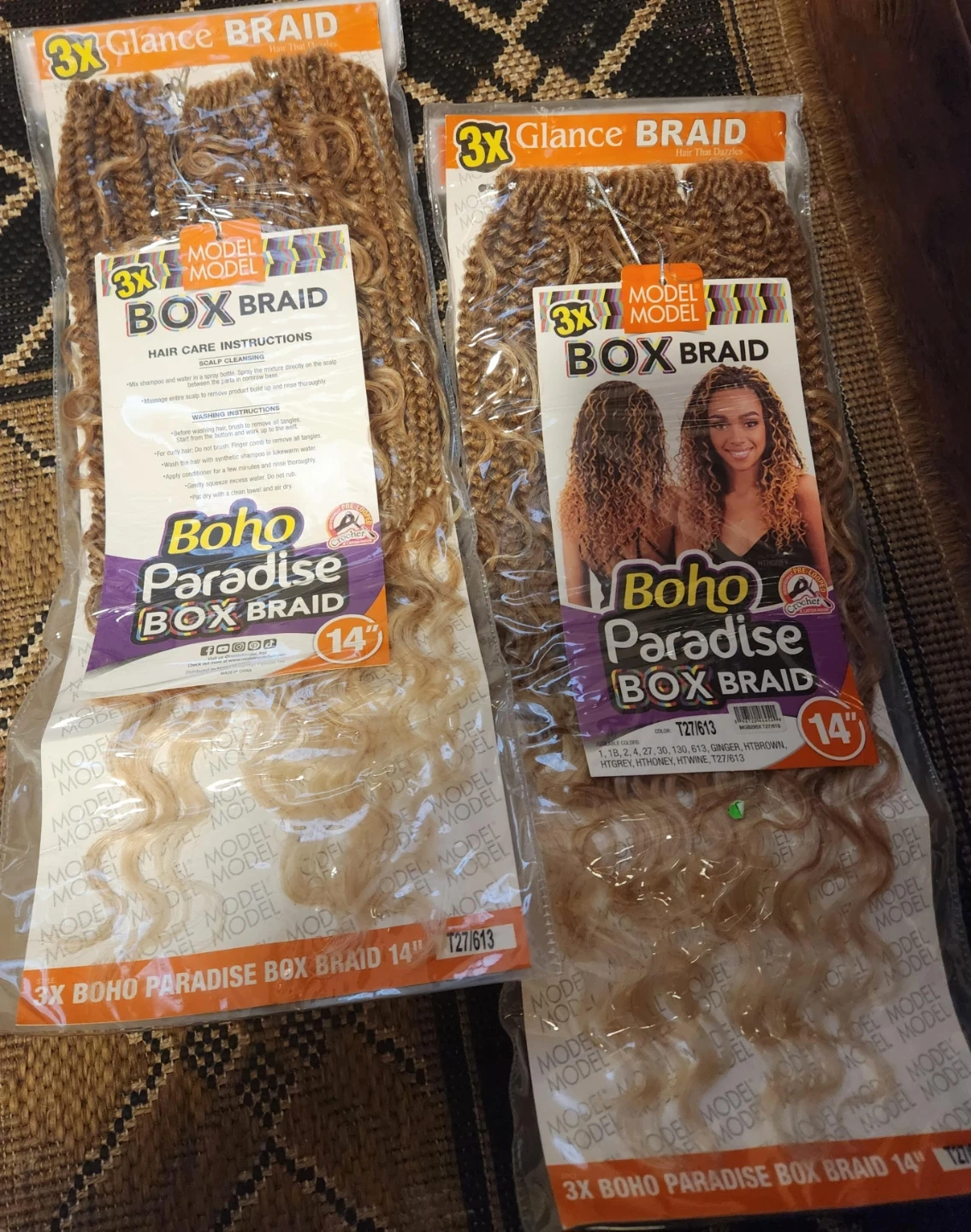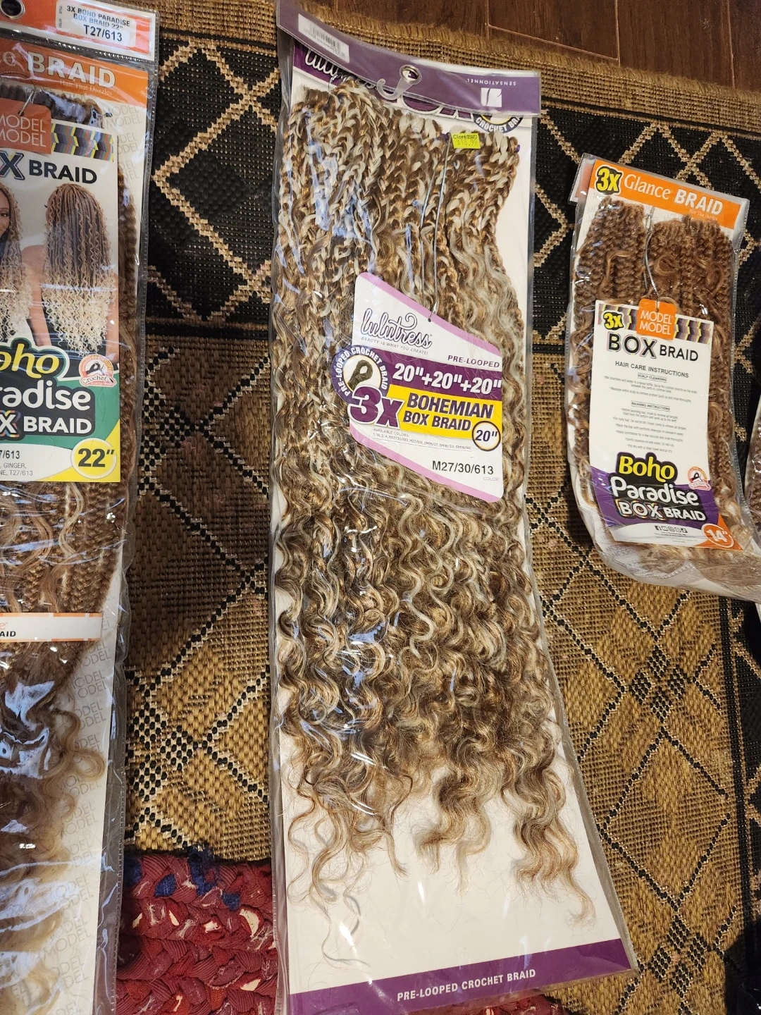 Selling two packs of 3X Boho Paradise Box Braid, one 14" and one 22". Also includes two packs of Crochet Water Wave Braid, 24". Perfect for various protective hairstyles!
