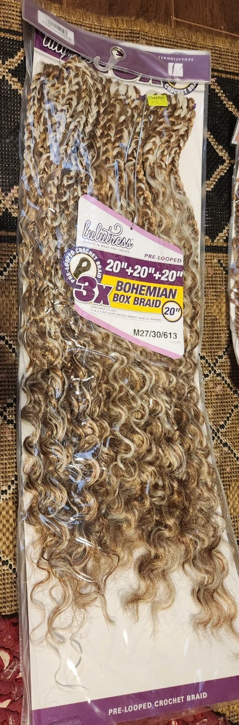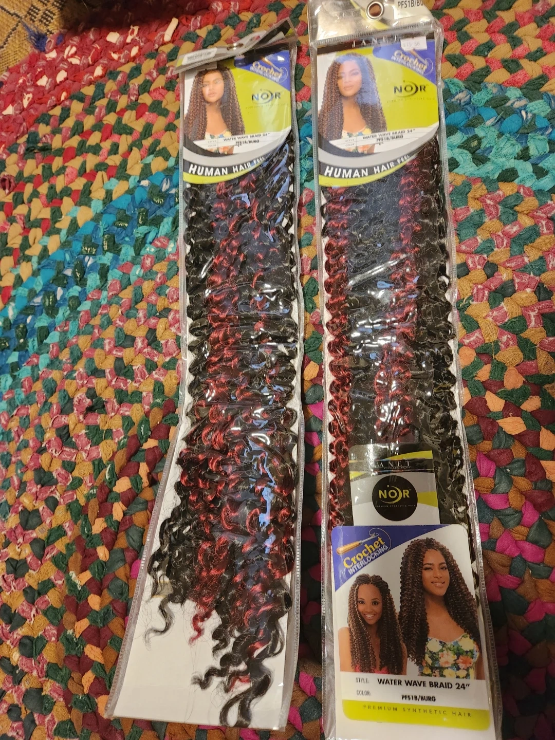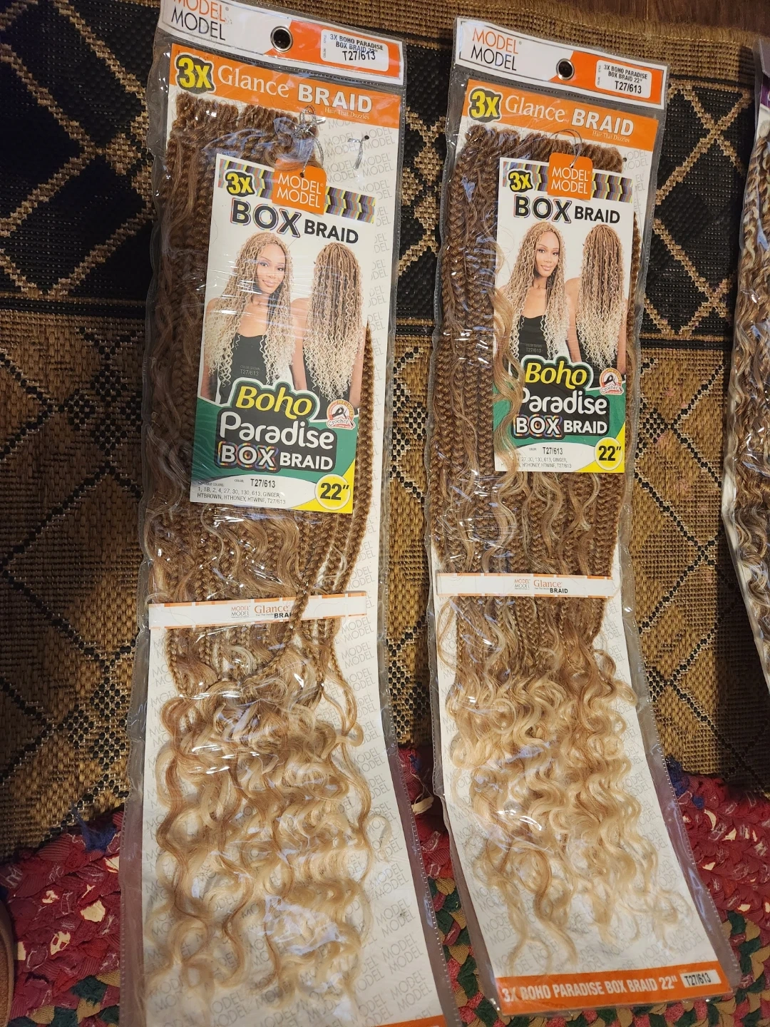 Selling two packs of 3X Boho Paradise Box Braid, one 14" and one 22". Also includes two packs of Crochet Water Wave Braid, 24". Perfect for various protective hairstyles!