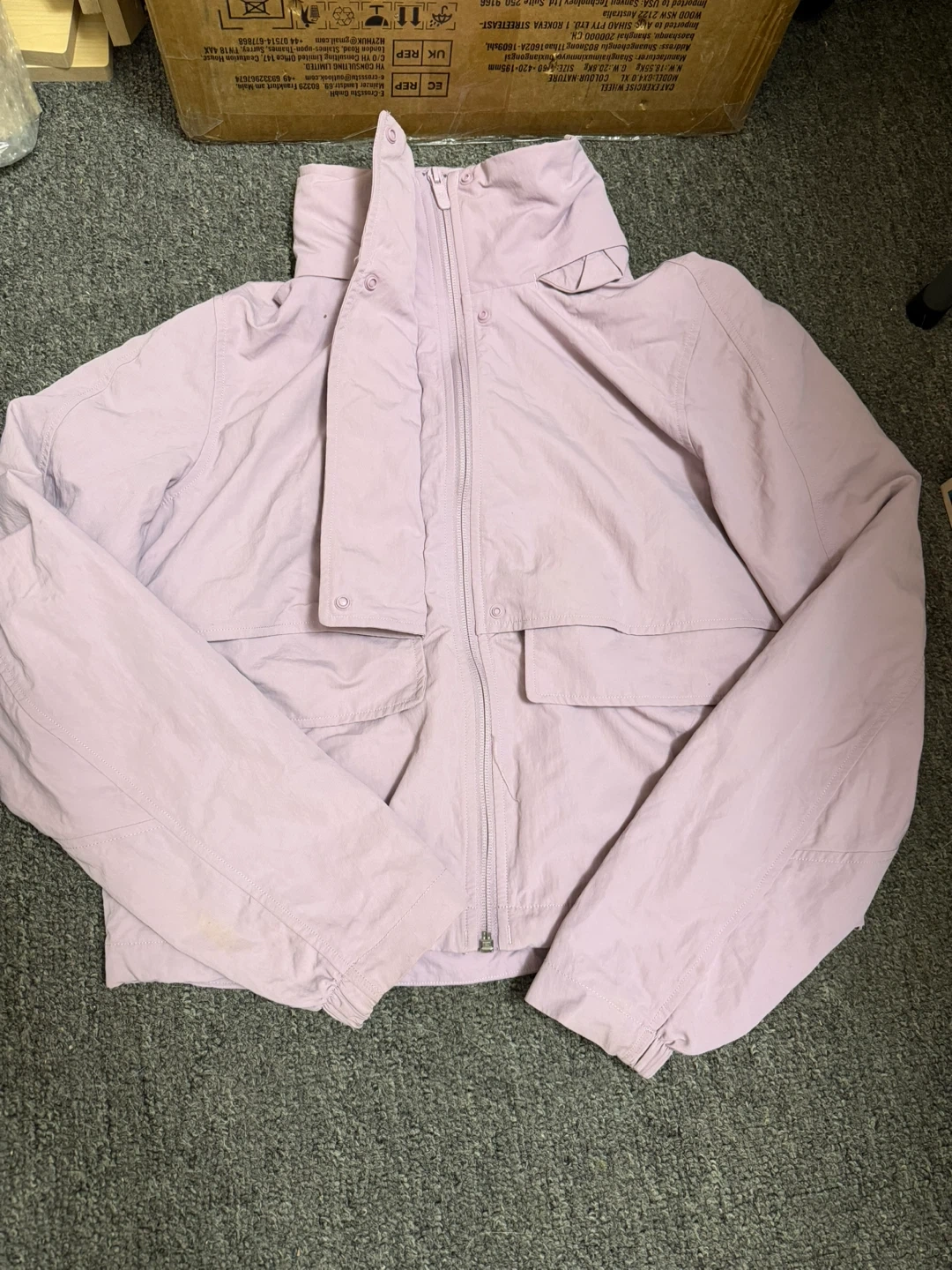 Lightweight Lululemon hooded jacket in a soft lavender colour. It's designed with a full zip closure and front pockets. This jacket is perfect for casual wear or light outdoor activities.
