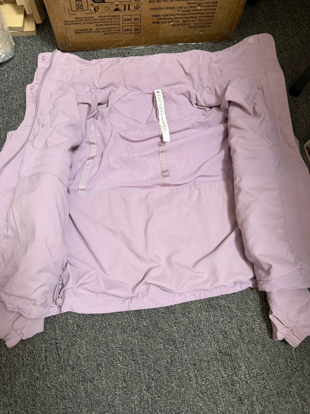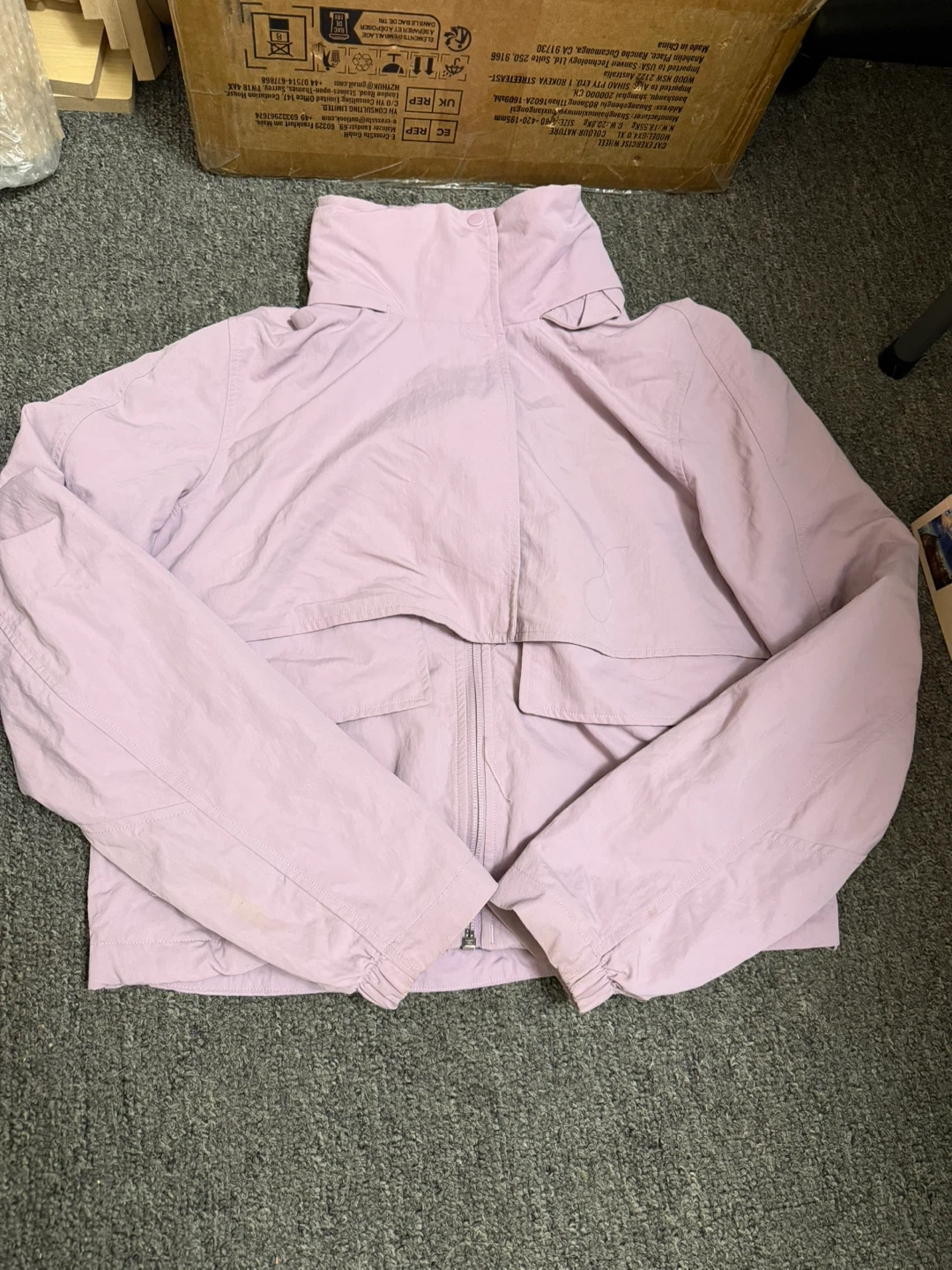 Lightweight Lululemon hooded jacket in a soft lavender colour. It's designed with a full zip closure and front pockets. This jacket is perfect for casual wear or light outdoor activities.