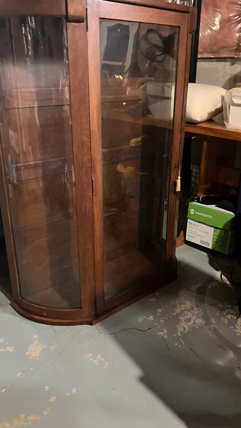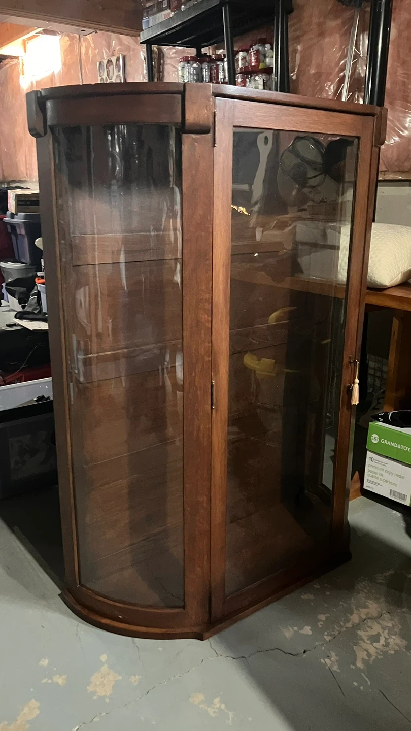 This is a beautiful wooden display cabinet with glass doors. It features multiple shelves for displaying items. The wood has a rich, dark finish. It's a lovely piece for a living room or dining area! Can be separate or glass hutch sits on top of sideboard