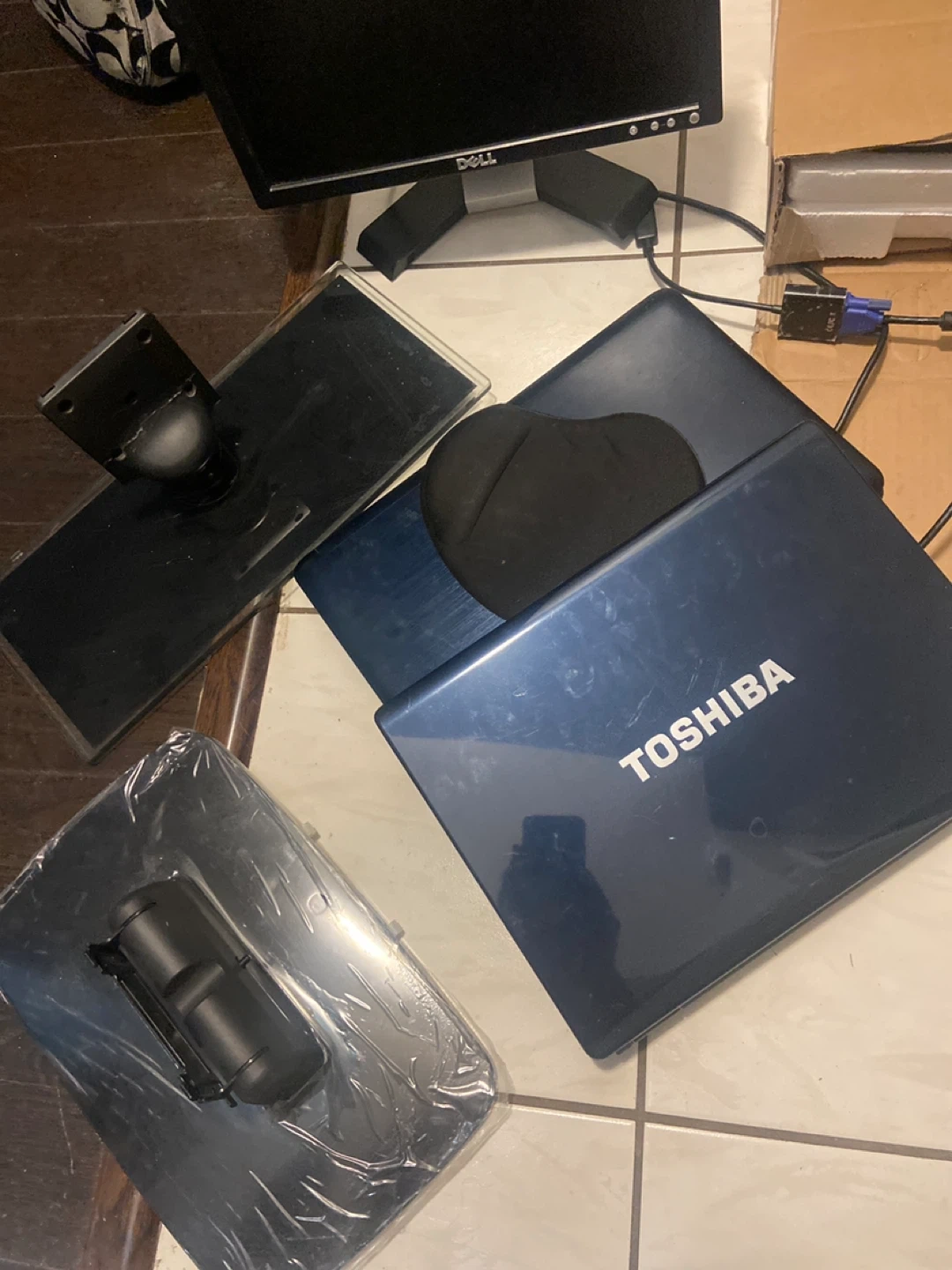 Bundle includes one Toshiba laptop and two monitors, one Dell and one LG. Also includes various cables and accessories. Great for parts and send back home