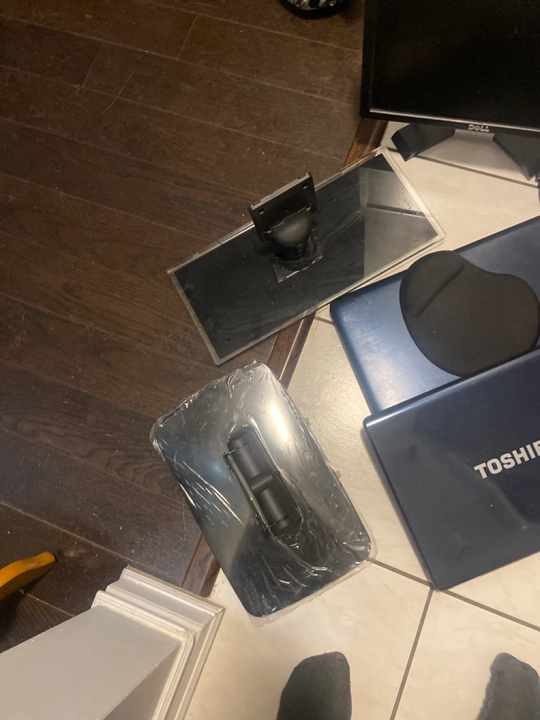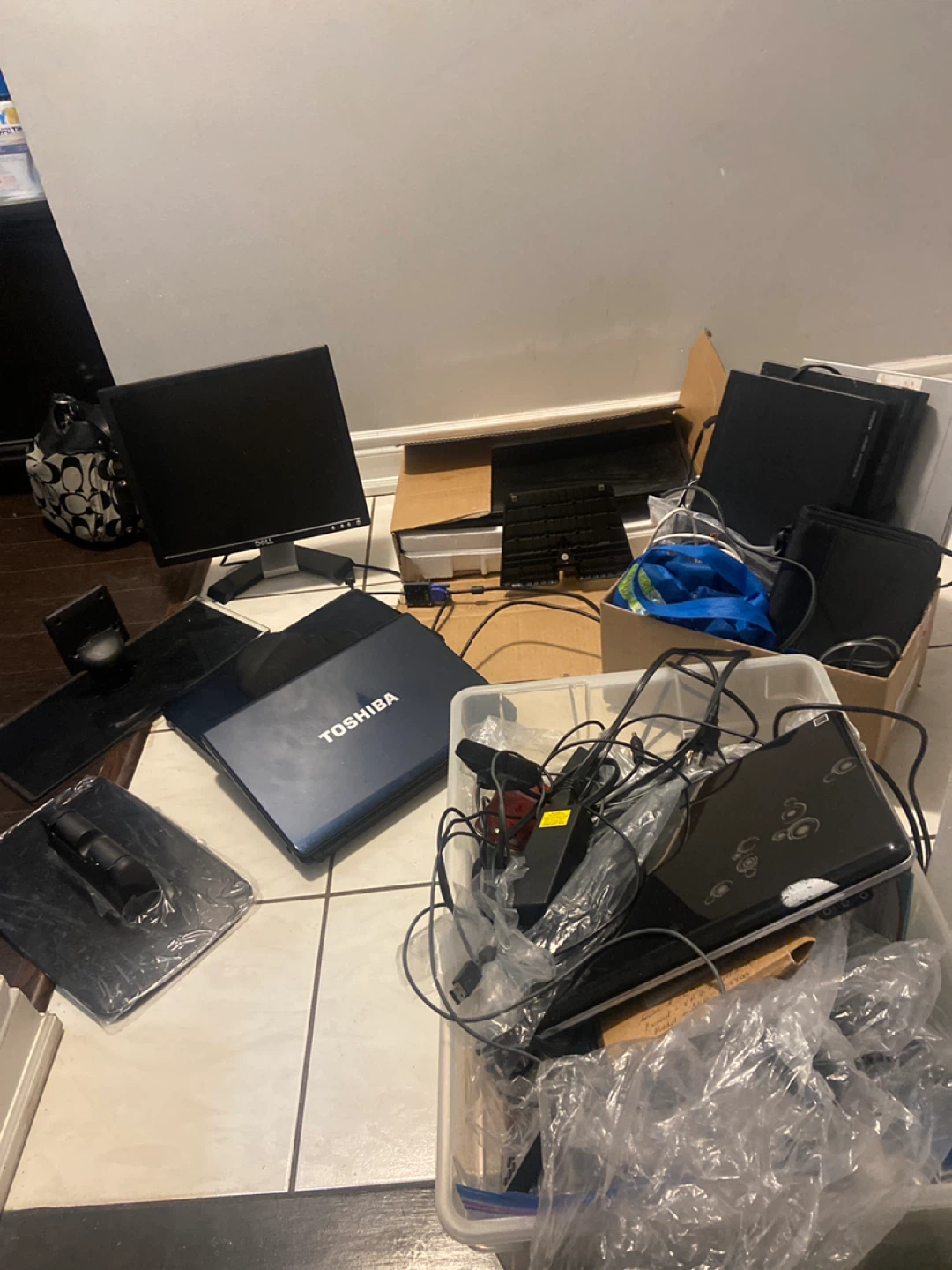 Bundle includes one Toshiba laptop and two monitors, one Dell and one LG. Also includes various cables and accessories. Great for parts and send back home