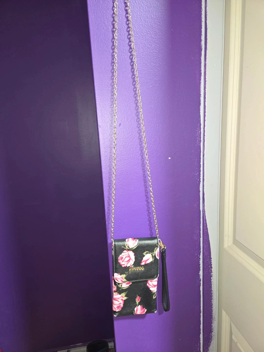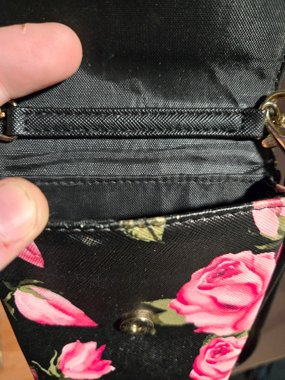 This Guess wallet bag features a black background with a beautiful pink floral rose print. It has multiple card slots on the back and a secure flap closure. A convenient wrist strap and a long chain strap are included. Retails for 90$