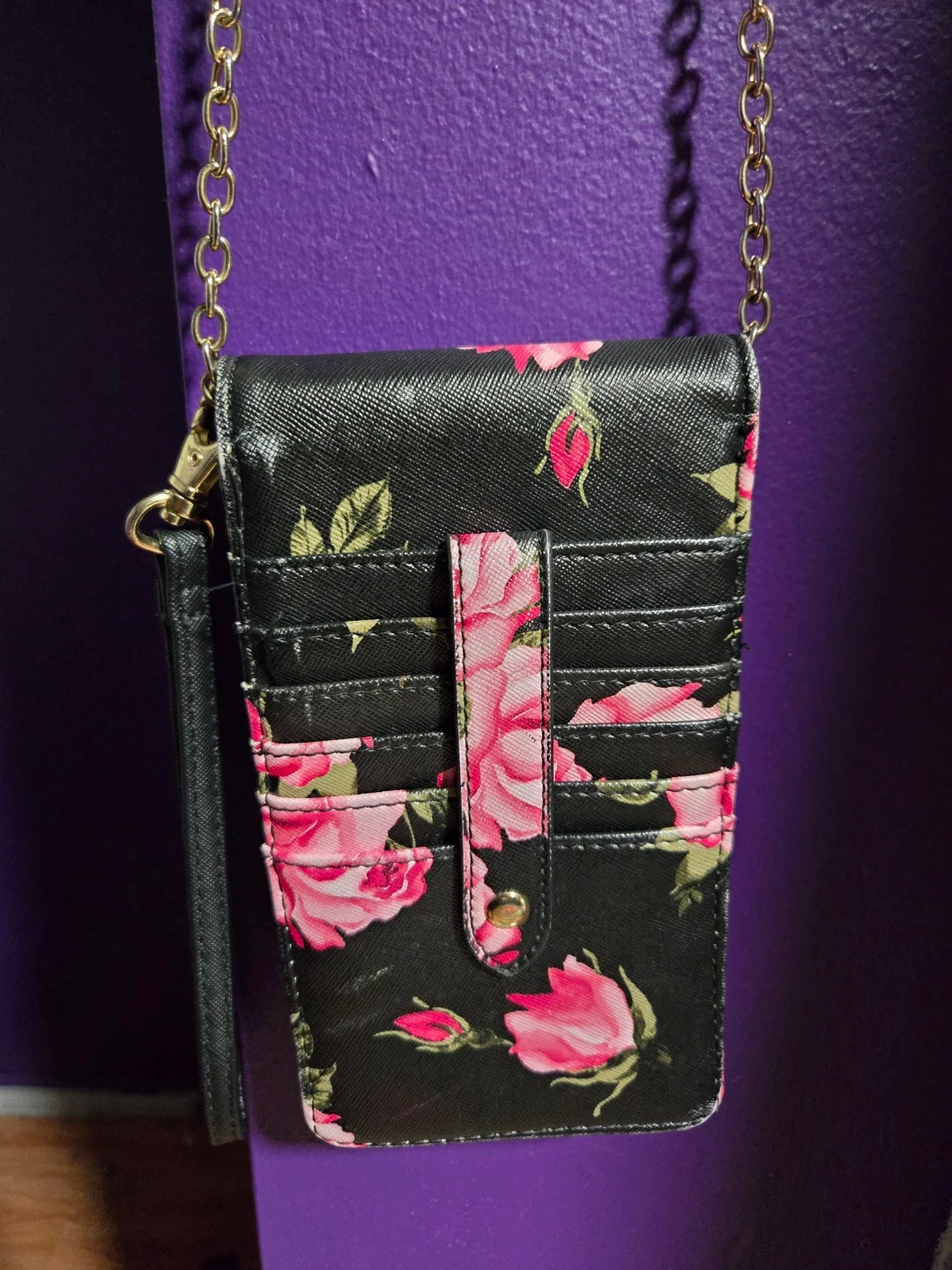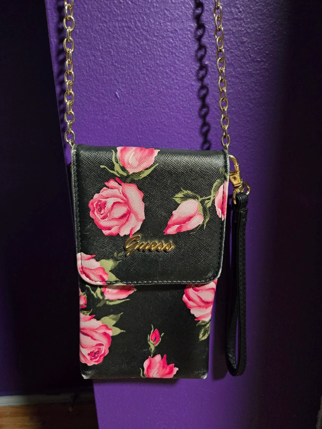 This Guess wallet bag features a black background with a beautiful pink floral rose print. It has multiple card slots on the back and a secure flap closure. A convenient wrist strap and a long chain strap are included. Retails for 90$