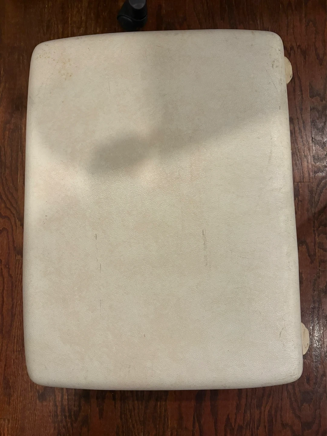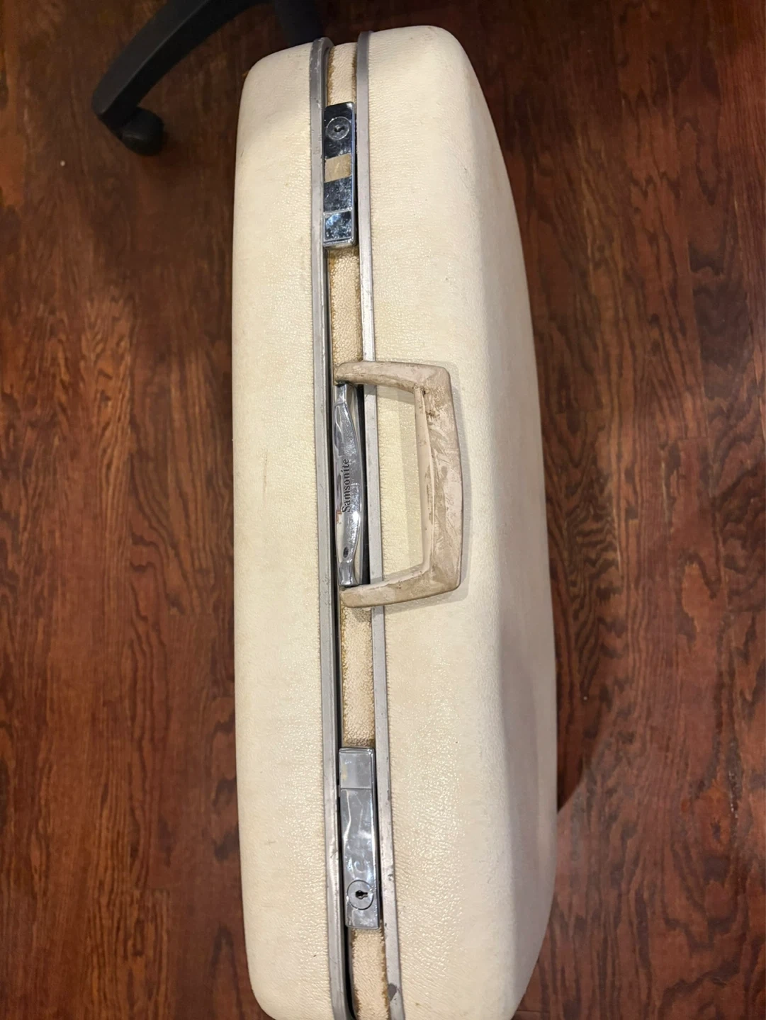 Vintage Samsonite hardside suitcase. Measures approximately 24 inches long and 20 inches high. It's a classic cream colour with silver latches and a sturdy handle. Interior includes securing straps.