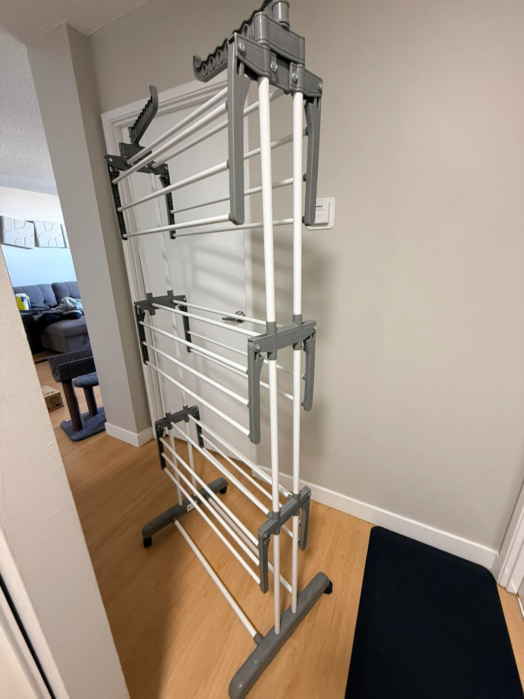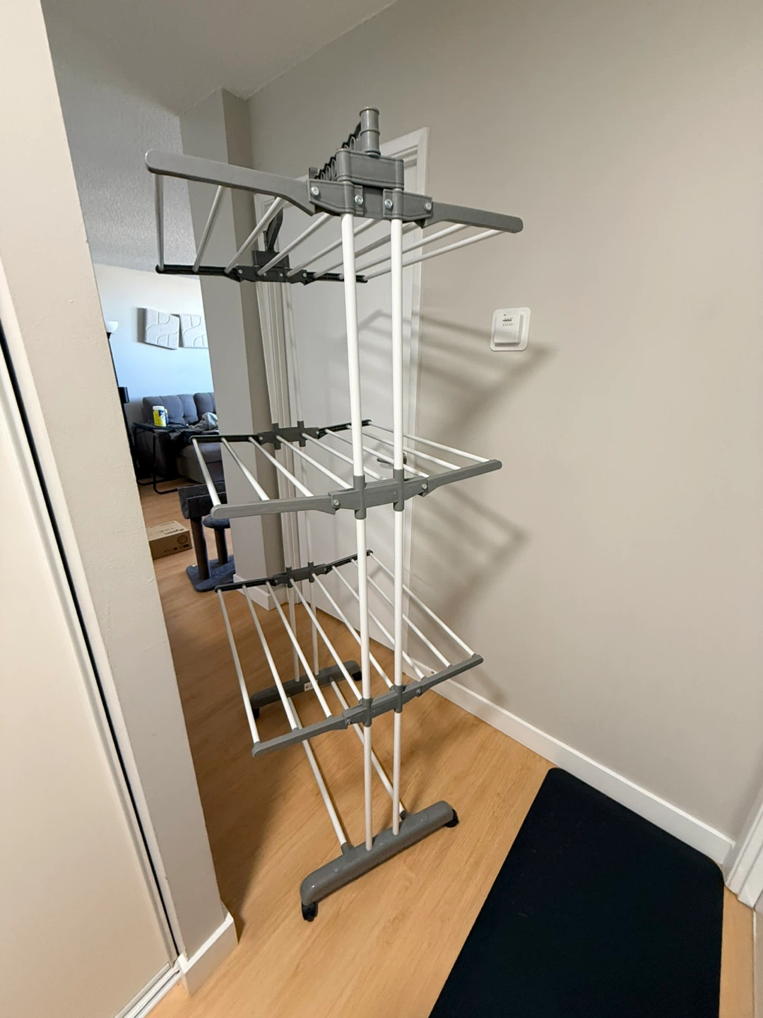 A grey and white 3-tier drying rack for laundry. It's made of plastic and metal. This rack is great for small spaces or apartments when you need extra drying room for clothes.
