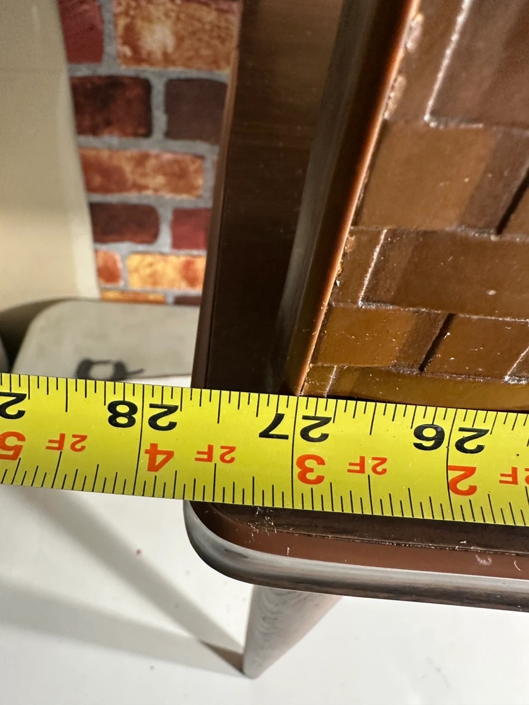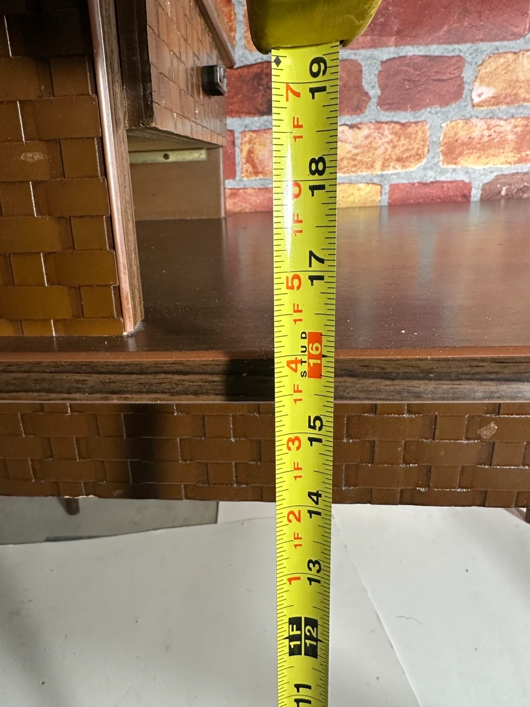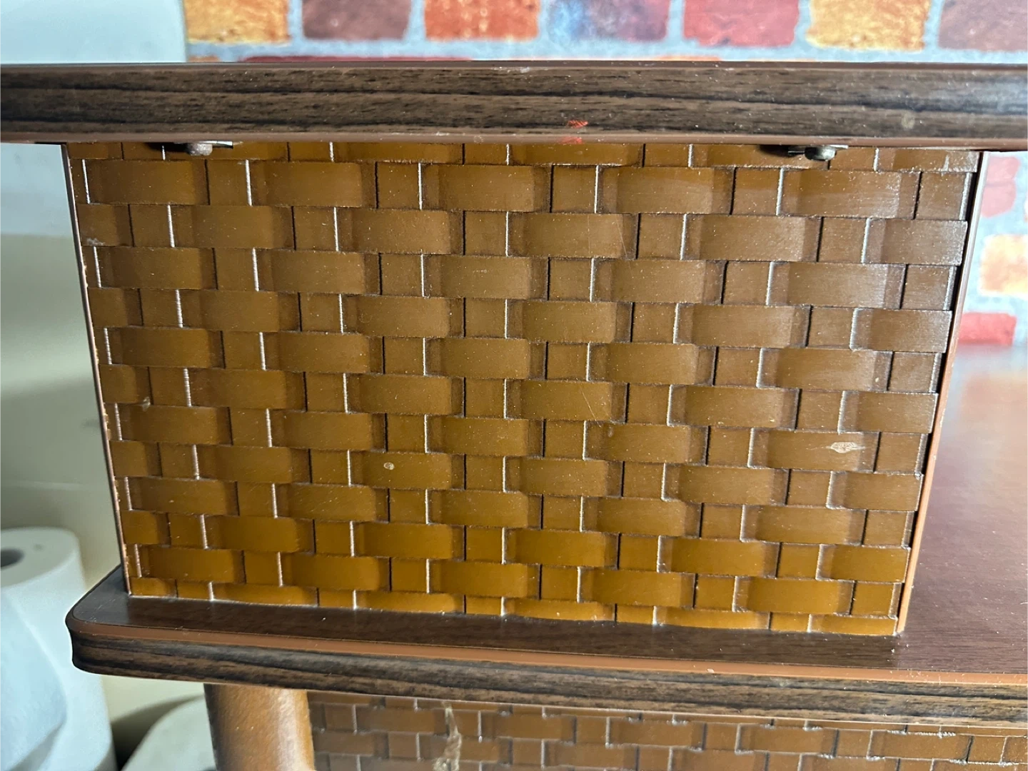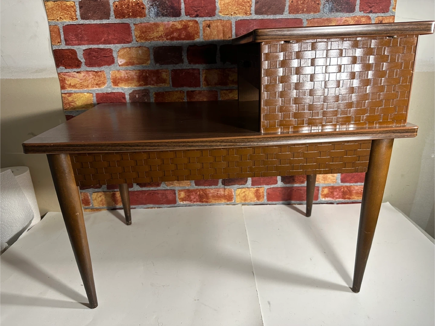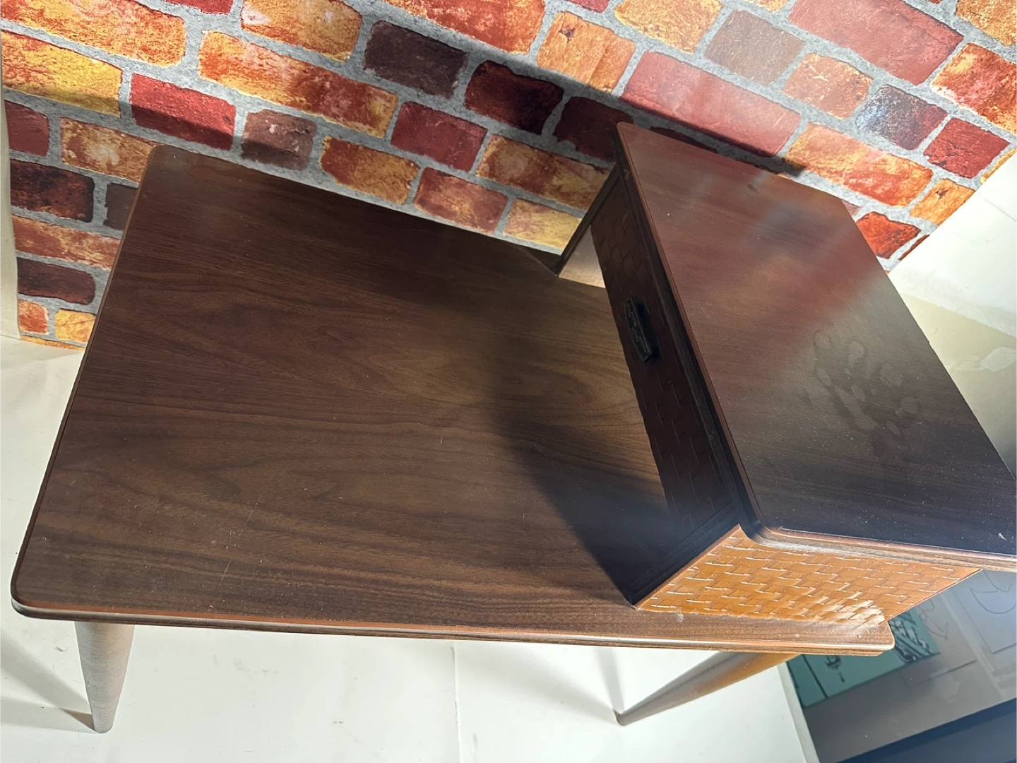 This vintage side table features a beautiful dark wood finish with woven basket detailing on the drawer and legs. It includes a convenient pull-out drawer for storage. Perfect for placing beside a sofa or chair.