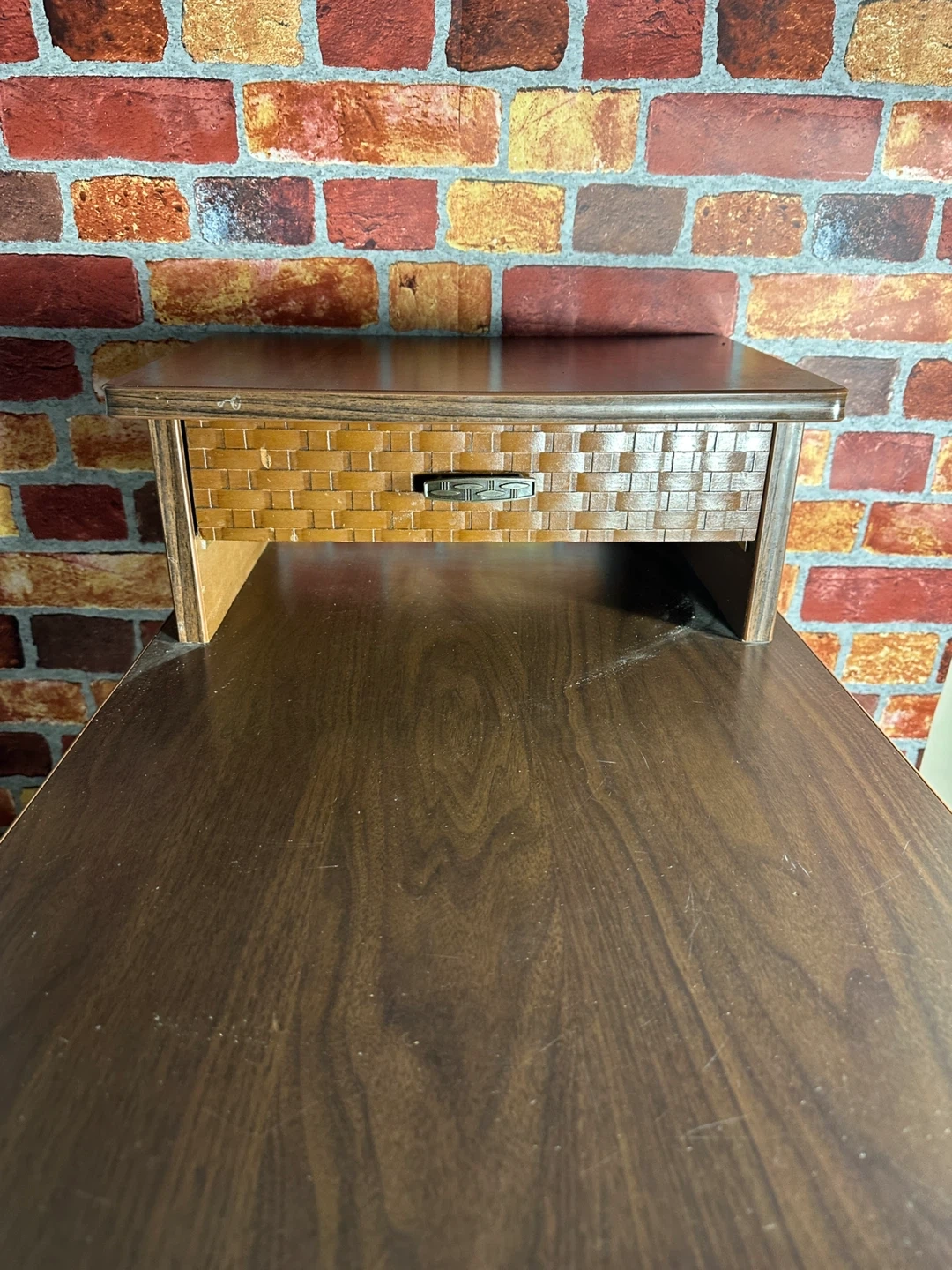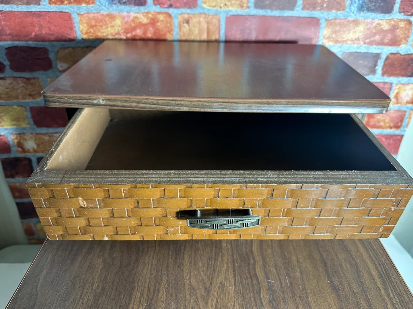 This vintage side table features a beautiful dark wood finish with woven basket detailing on the drawer and legs. It includes a convenient pull-out drawer for storage. Perfect for placing beside a sofa or chair.
