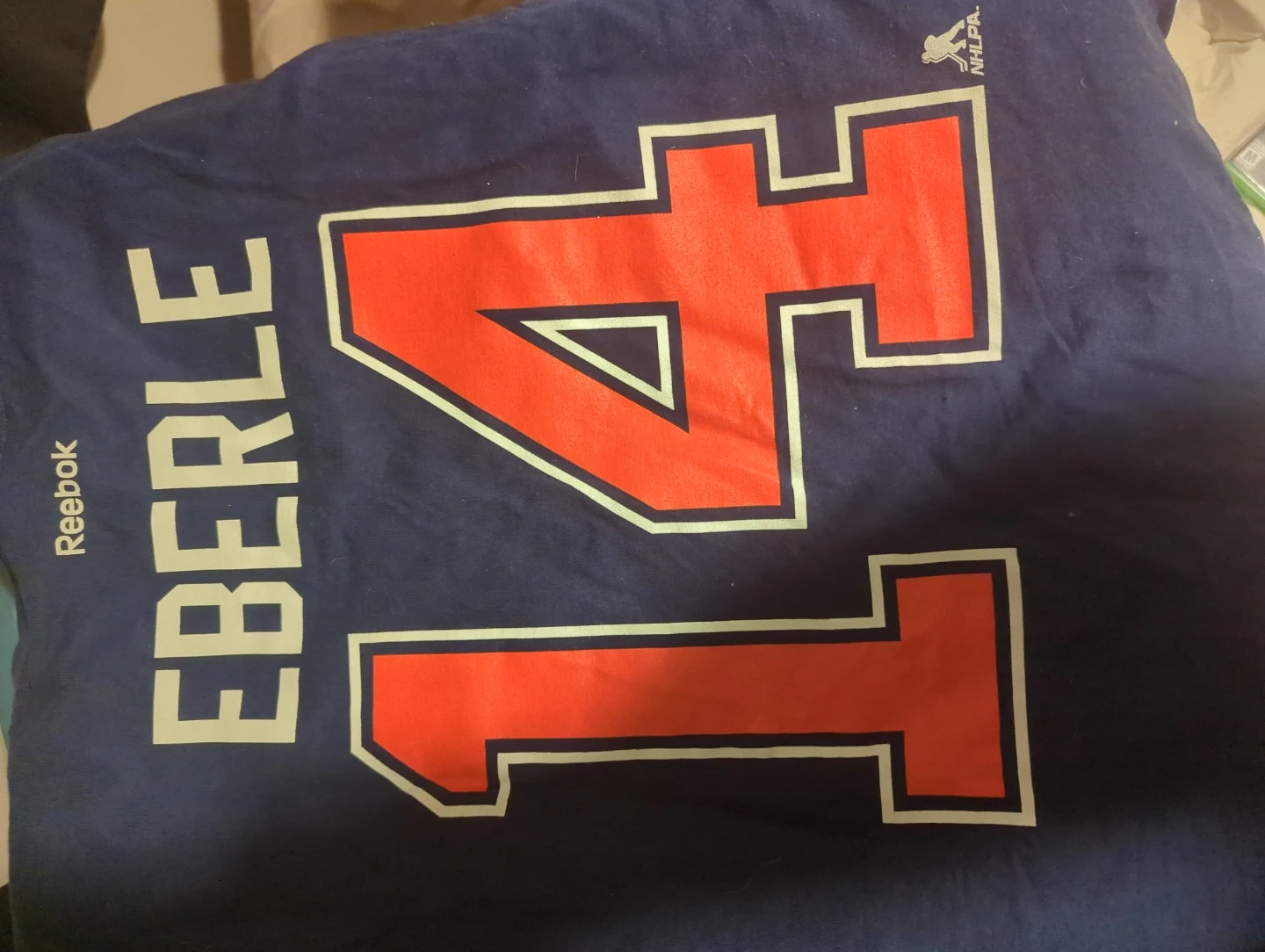 This is a navy blue Reebok t-shirt featuring the Edmonton Oilers logo. It has 'EBERLE' and the number '14' on the back. Made of 100% cotton. Size Large. Never worn