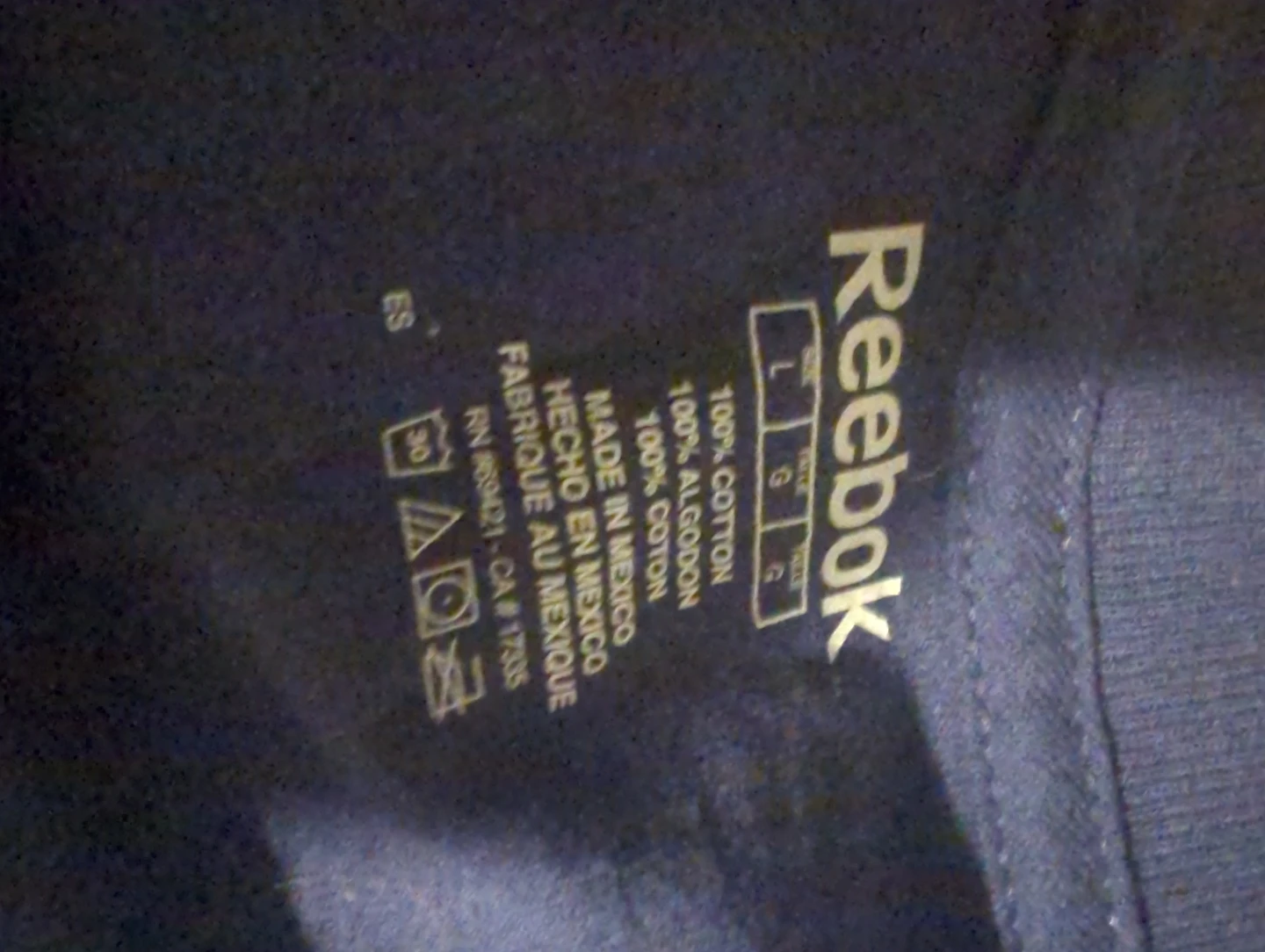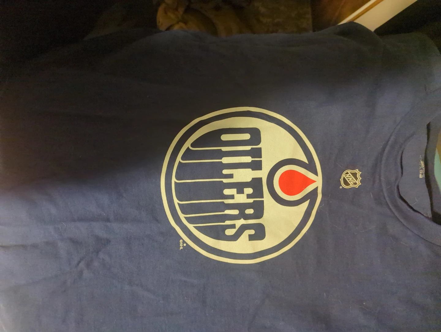This is a navy blue Reebok t-shirt featuring the Edmonton Oilers logo. It has 'EBERLE' and the number '14' on the back. Made of 100% cotton. Size Large. Never worn