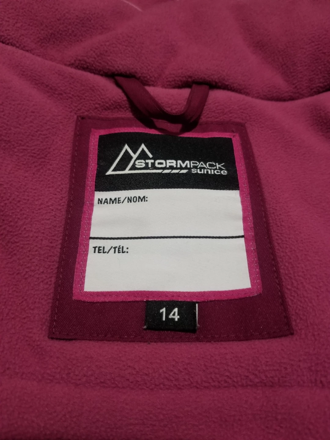 This is a Stormpack Sunice girls' winter jacket. It's a Kids size 14. The jacket is pink and purple. It's great for keeping warm in cooler weather! Asking Just $10 Please let me know if Interested Thanks!