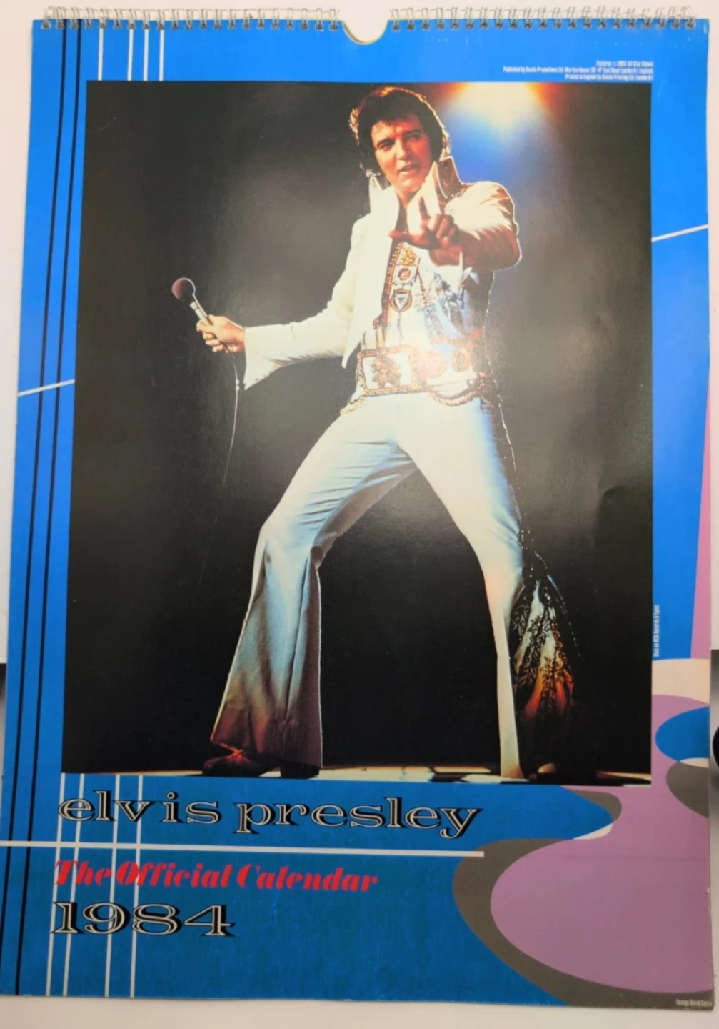 This is The Official Elvis Presley Calendar from 1984. It features images of Elvis Presley throughout the year. Spiral bound for easy page turning.
