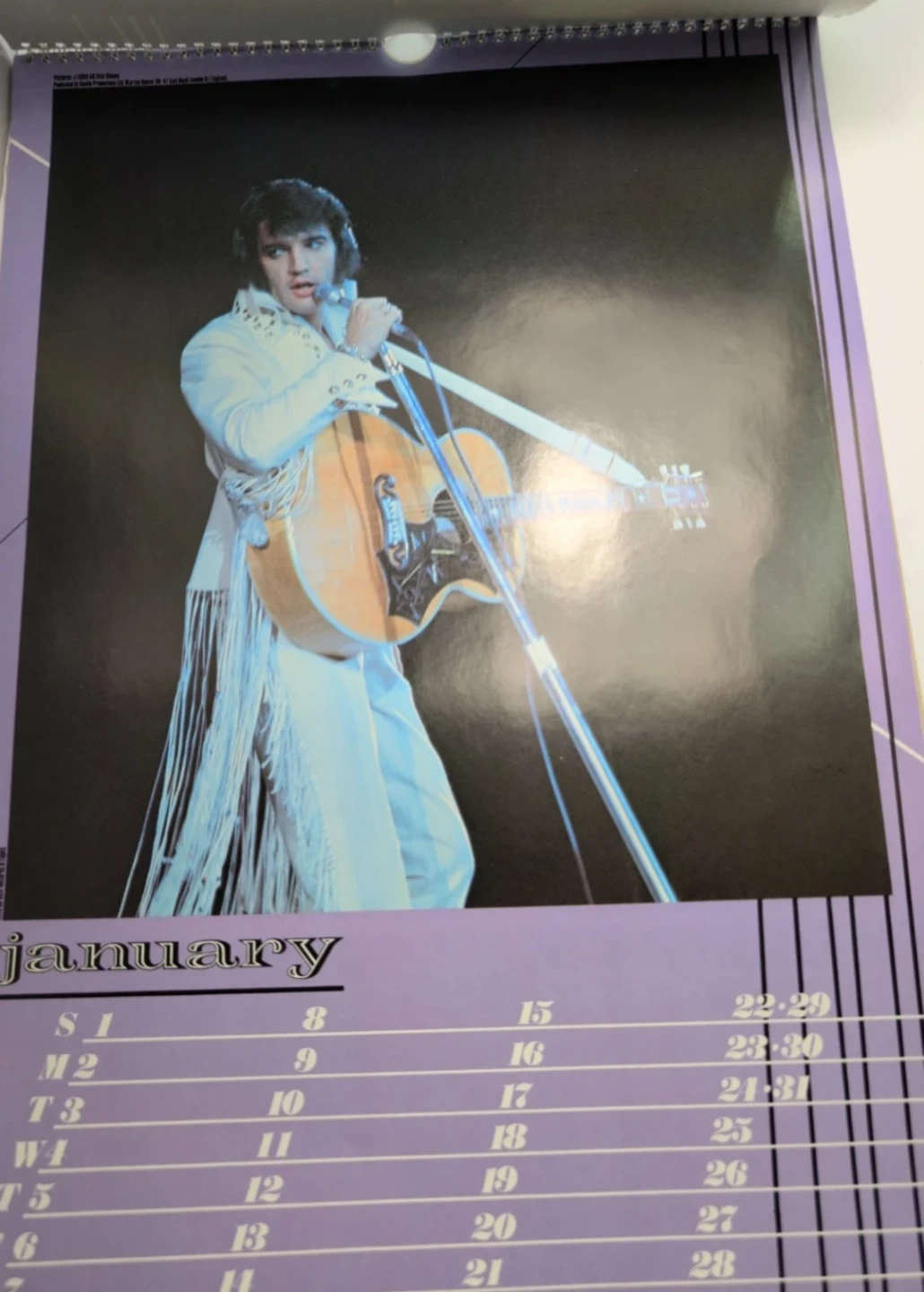 This is The Official Elvis Presley Calendar from 1984. It features images of Elvis Presley throughout the year. Spiral bound for easy page turning.