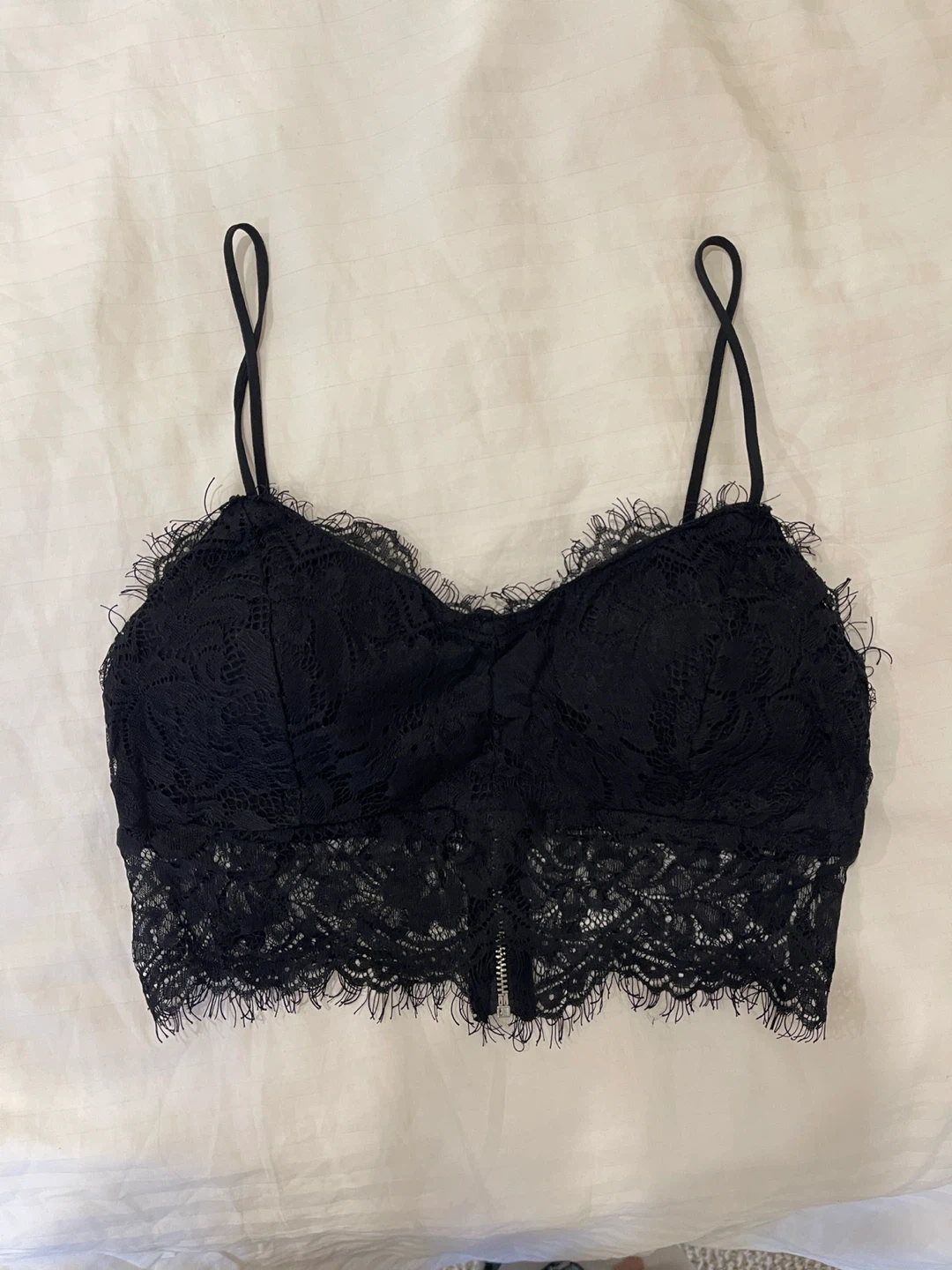 This is a black lace bralette. It's made with a soft lace overlay and adjustable spaghetti straps. Features a zippered back for easy wear. Lace material.