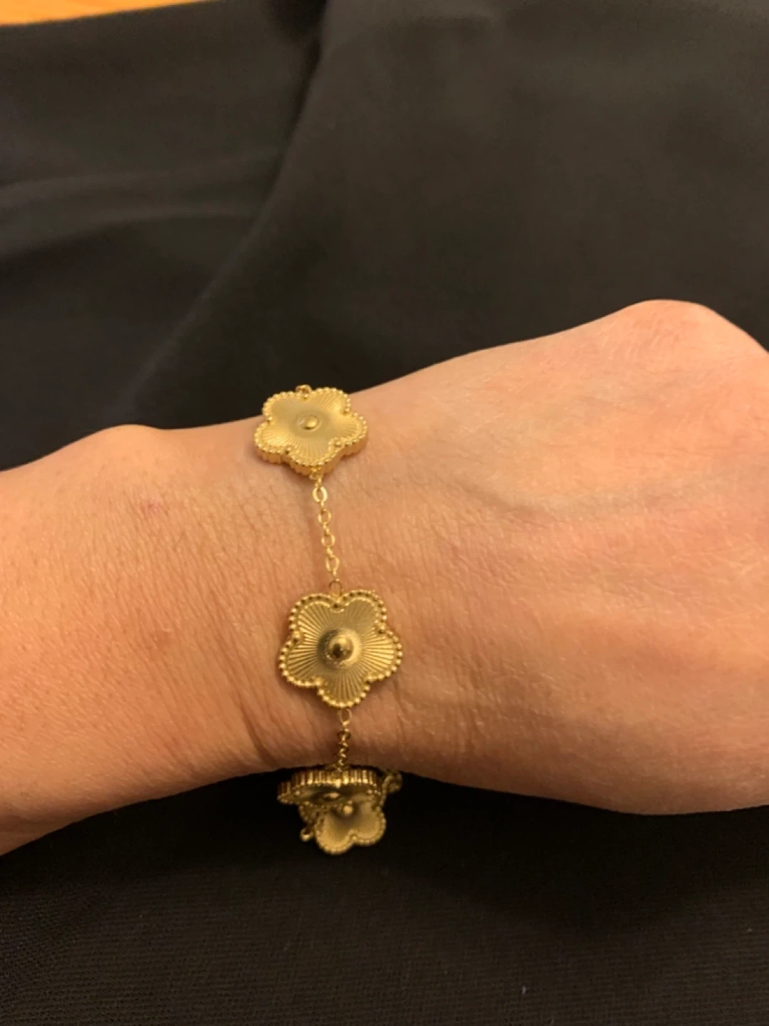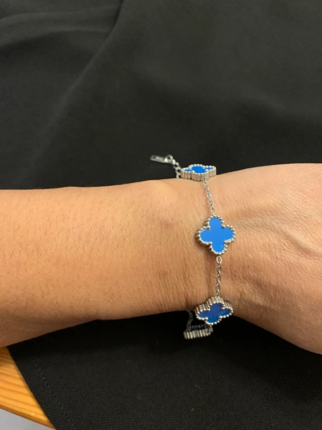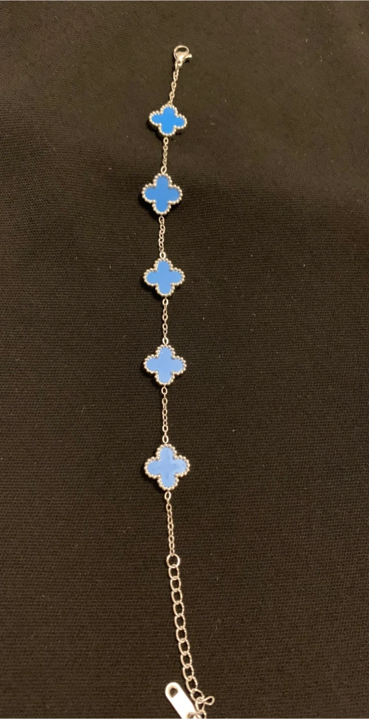 1. A delicate silver-tone bracelet featuring five blue clover-shaped charms.