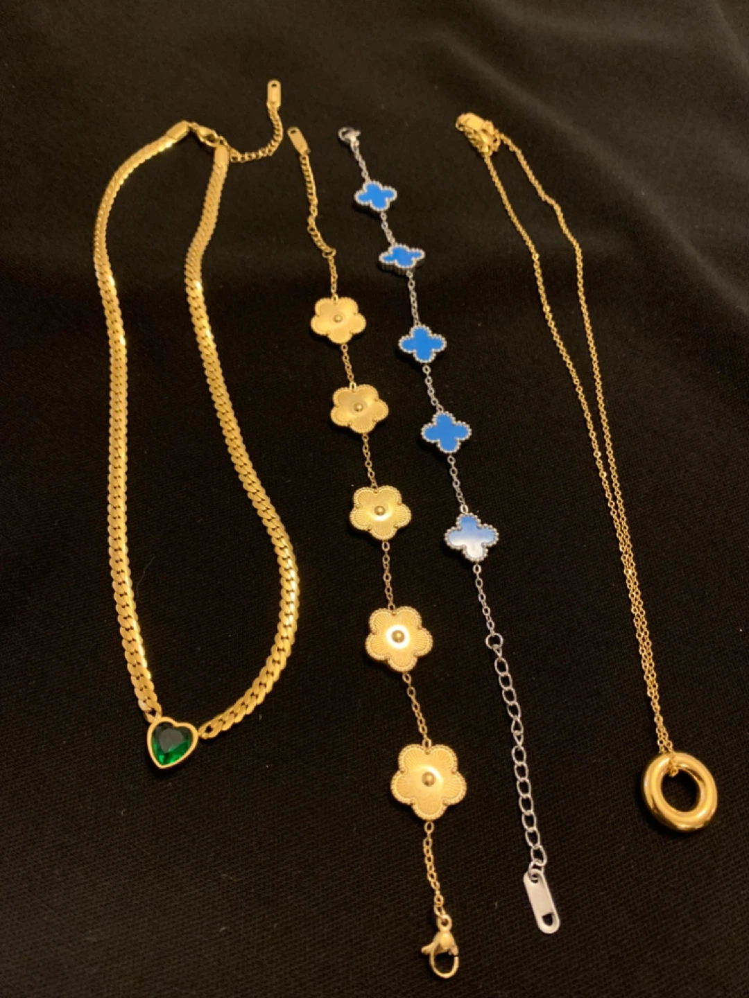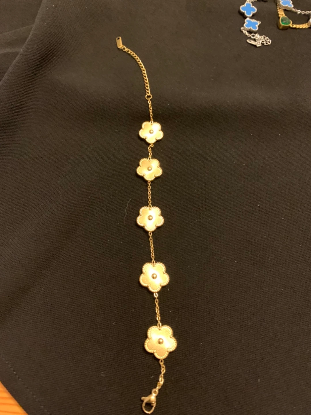 1. A delicate silver-tone bracelet featuring five blue clover-shaped charms.
