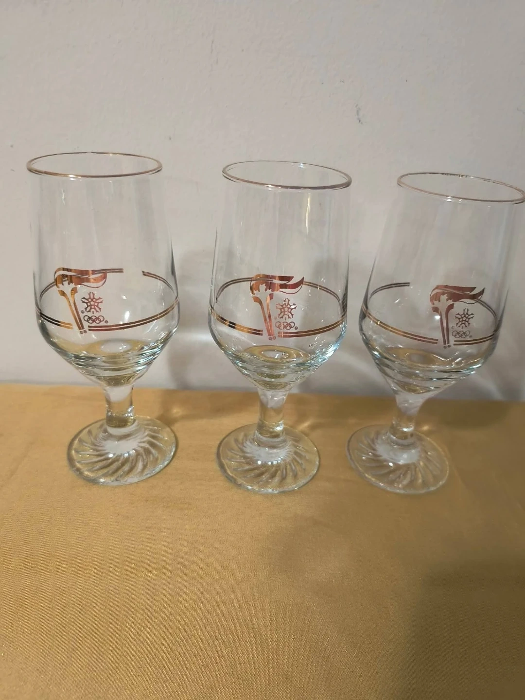 These are vintage 1988 Calgary Winter Olympics Torch Relay 22k gold-trimmed stemmed glasses.