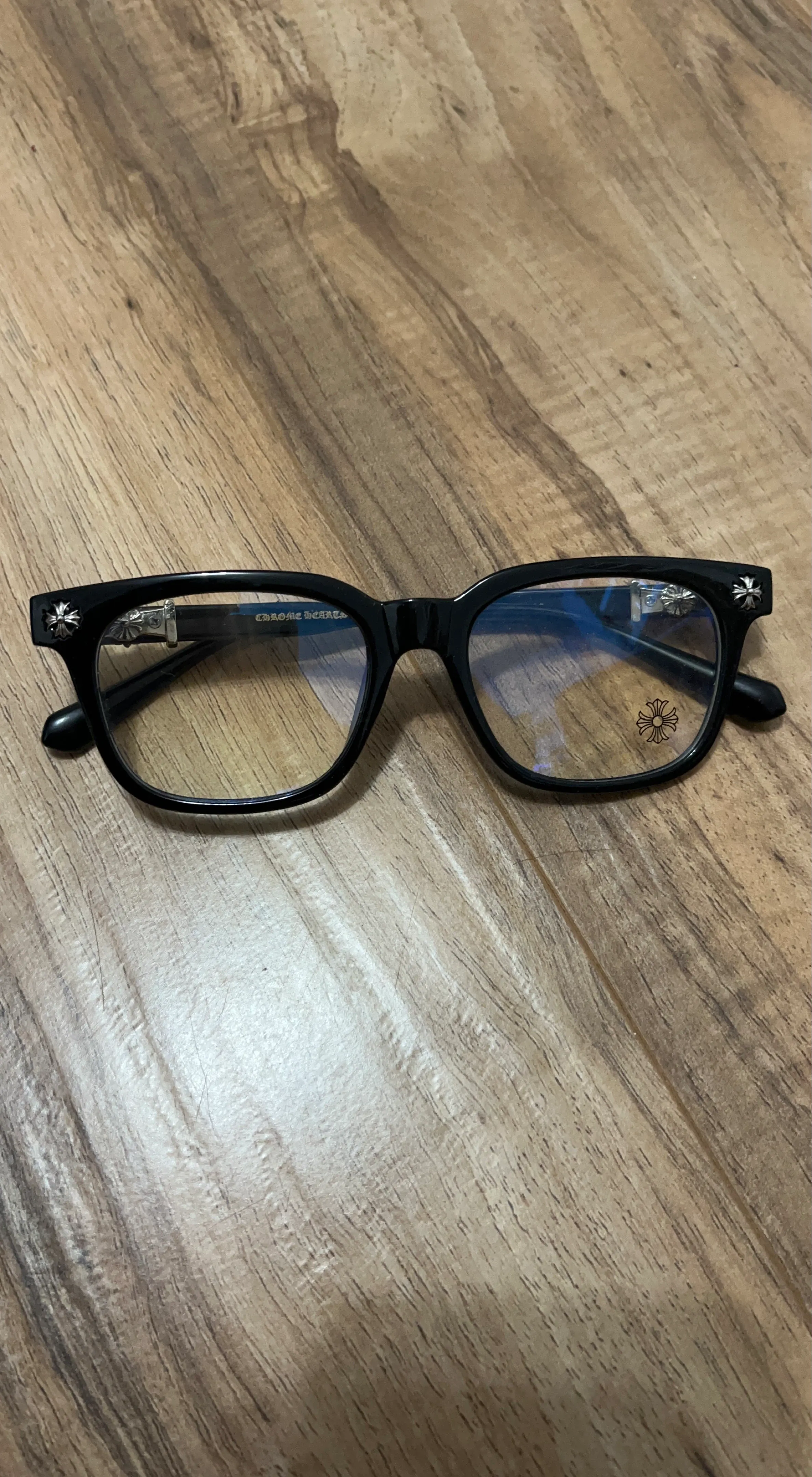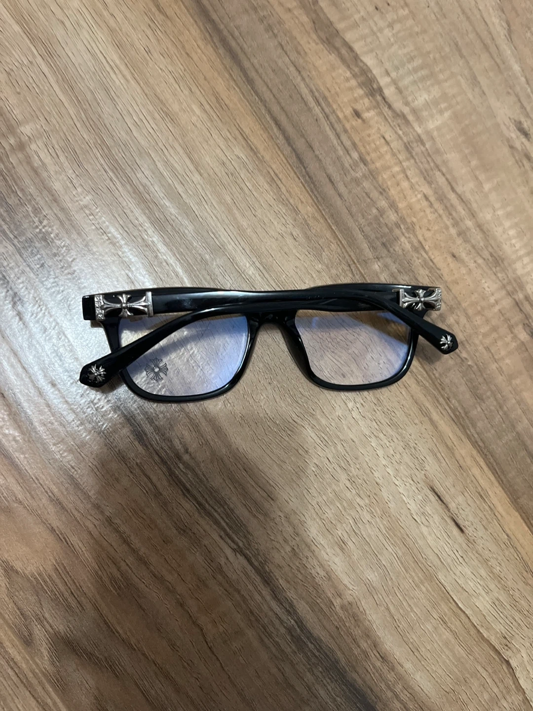 Chrome Hearts eyeglasses with a black frame. Features signature cross motifs on the temples. These are a stylish accessory for anyone looking for unique eyewear.