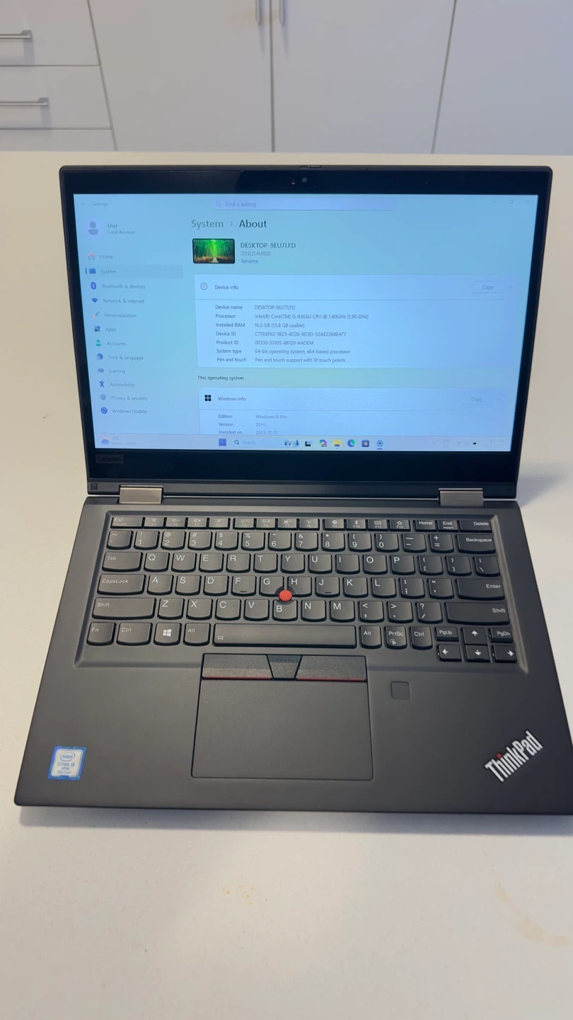 This is a Lenovo ThinkPad laptop with an Intel Core i5-8365U processor and 16GB of RAM. It has 256GB of storage and pen and touch support with 10 touch points. It's running Windows 11 Pro and was installed on 2025-12-21.